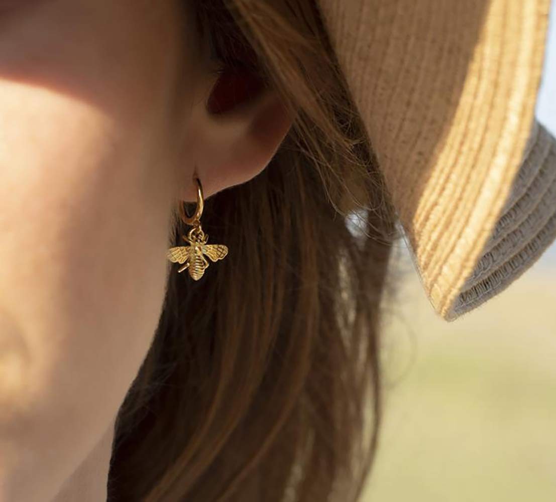 как выглядит Bee Huggie Hoop Earrings, 14K Gold Plated Cute Dangling Huggy 9mm, фото