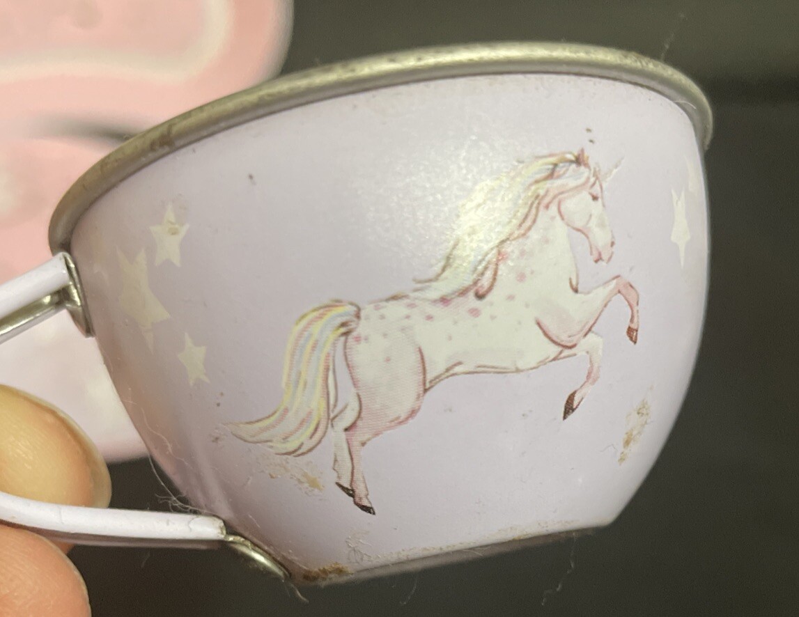 как выглядит Tin Play Pink Lilac Tea Set For 2 With White Horses Pattern; Tray,Plates,Cups фото