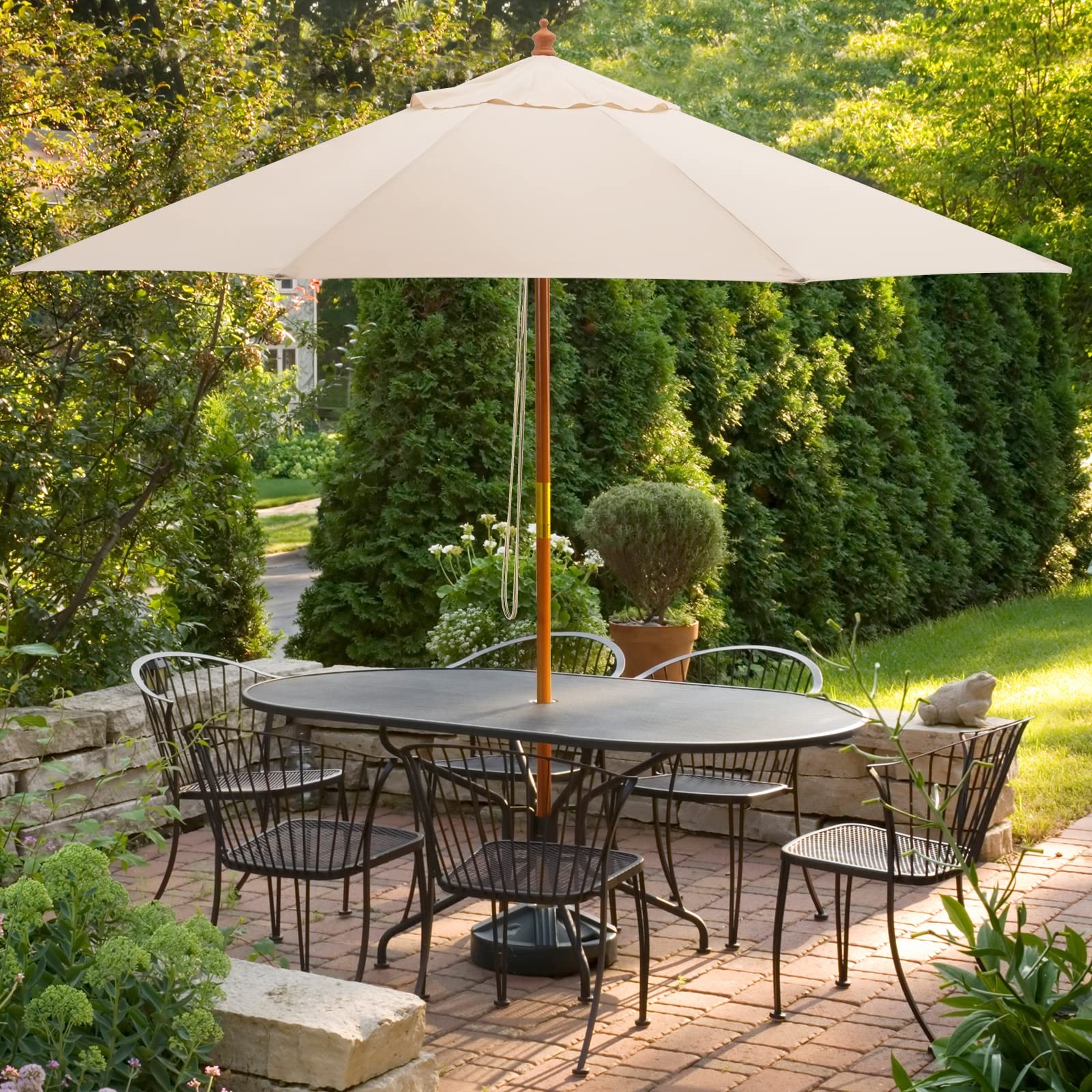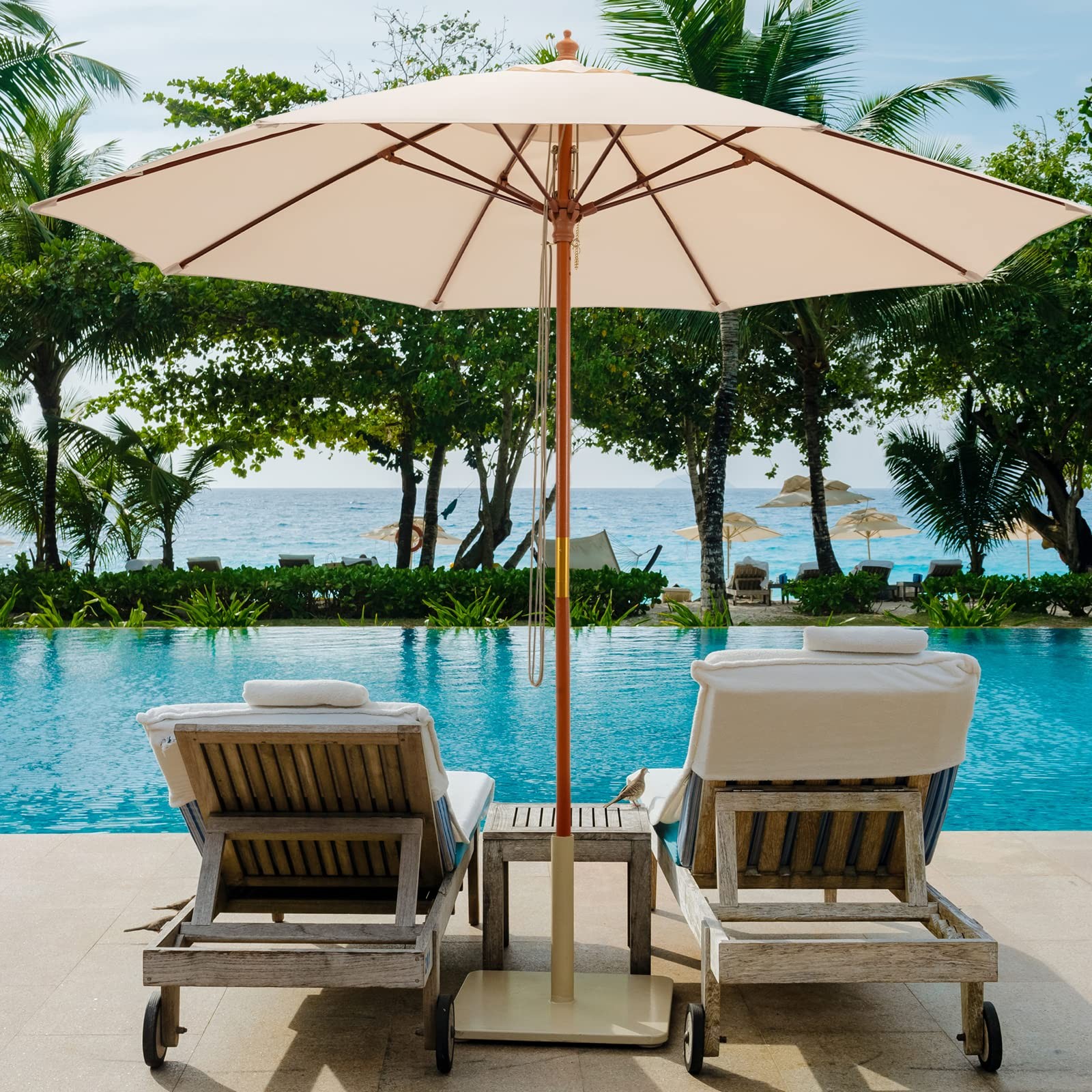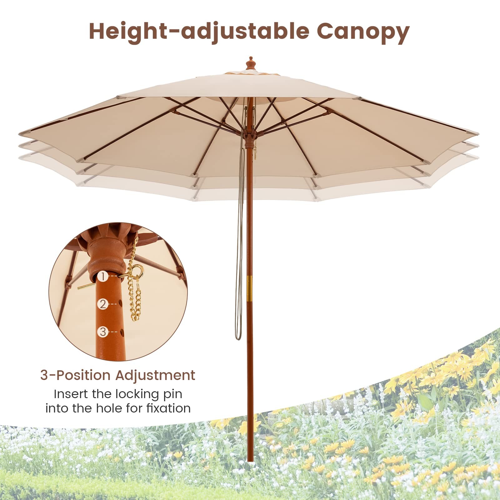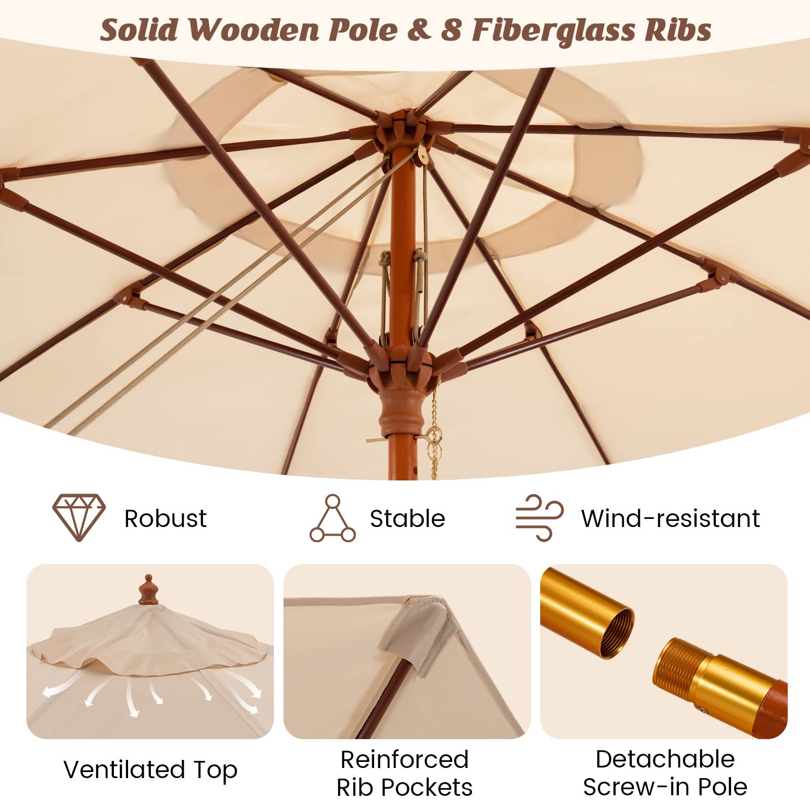 9.5 FT Patio Wooden Umbrella with Rope Pulley Lift 8 Bamboo Ribs