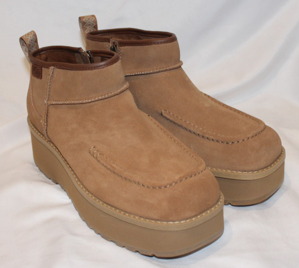 UGG WOMEN'S ULTRA MINI CITYFUNC SUEDE ZIP PLATFORM BOOTS SZ 8 NEW CHESTNUT