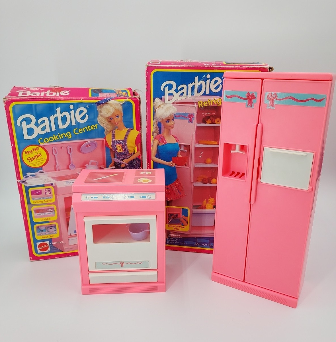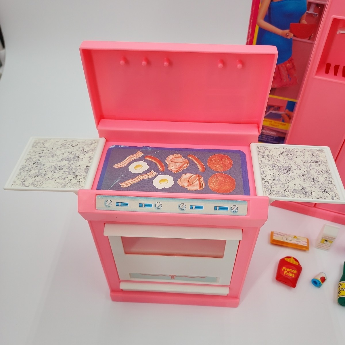 1992 Barbie Refrigerator With Food and Cooking Center With Pans In Their Boxes