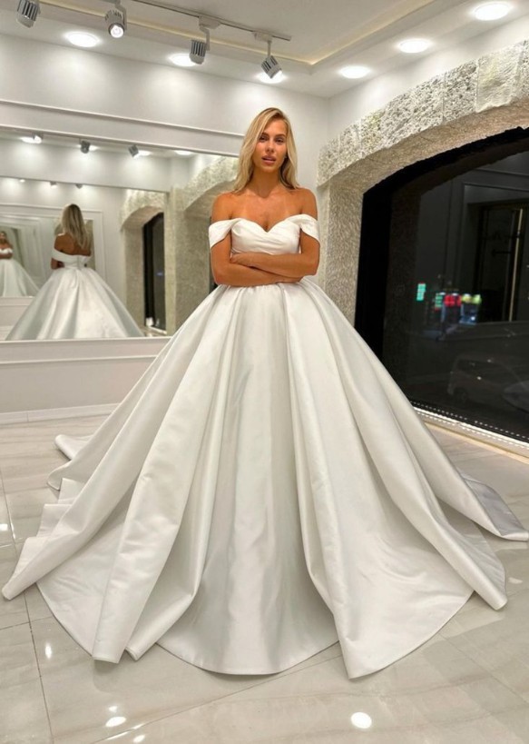 Classic Wedding Dresses White Ivory Satin Off Shoulder Sweep Train Bridal Gowns