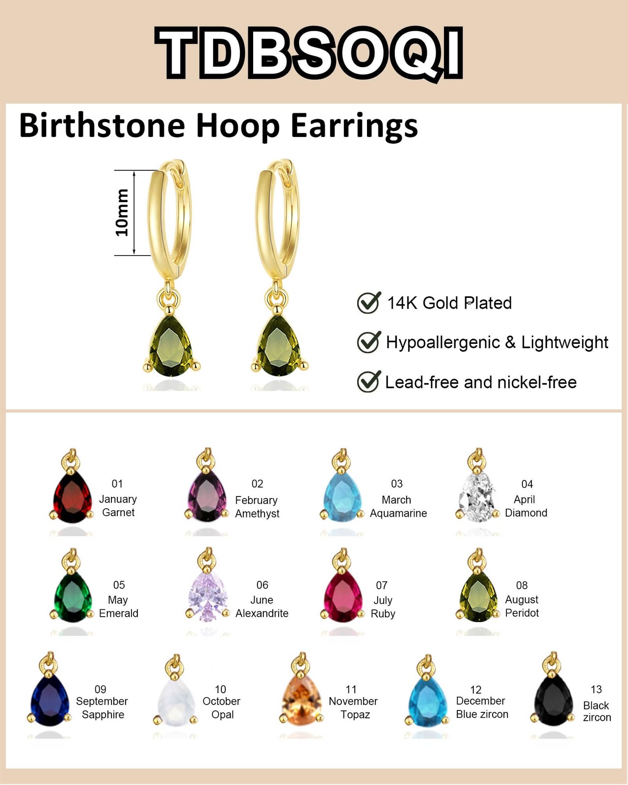 TDBSOQI 14K Gold 10mm hoop with a 0.6cm 0.4cm charm, 08.August - Peridot