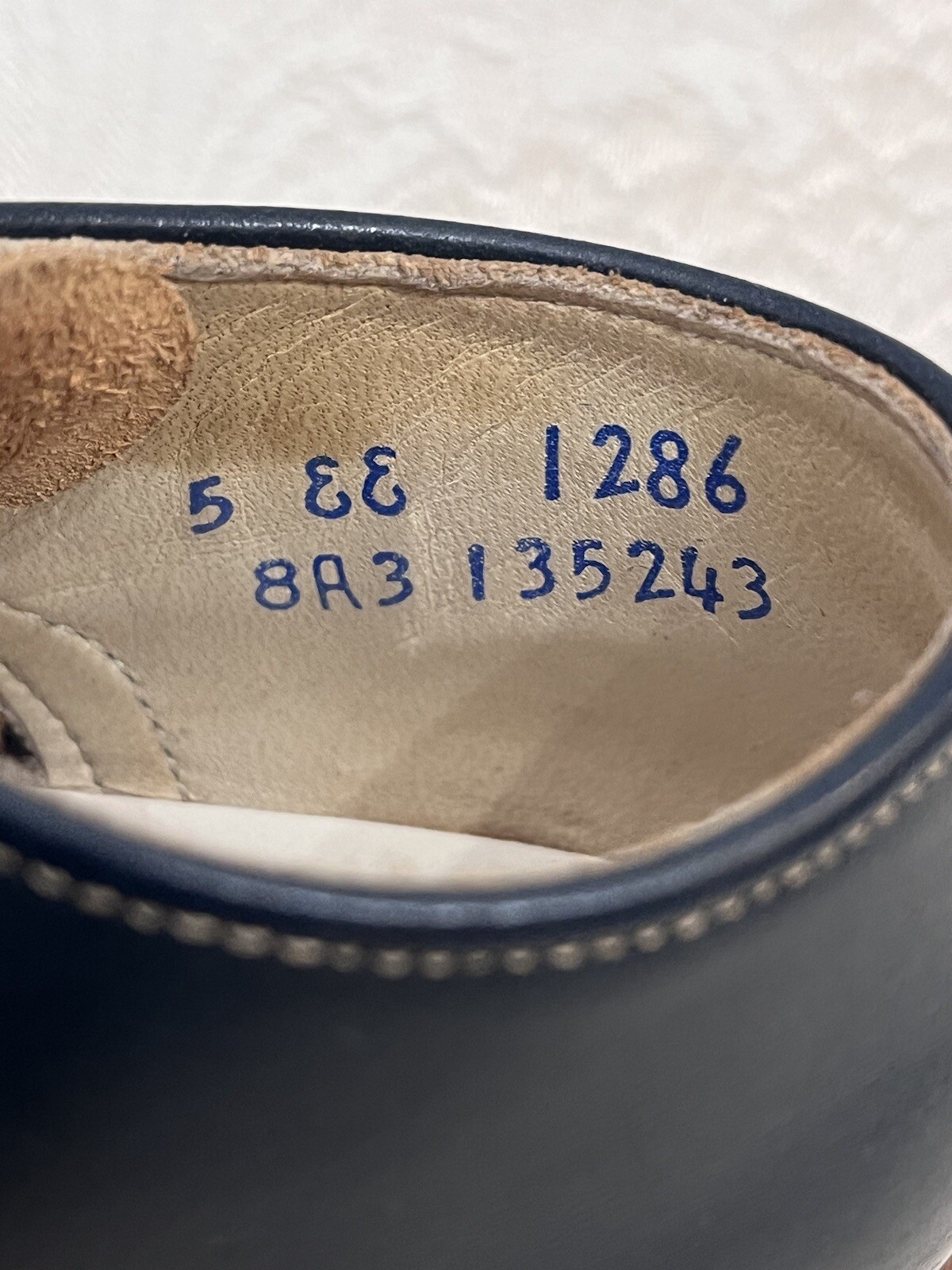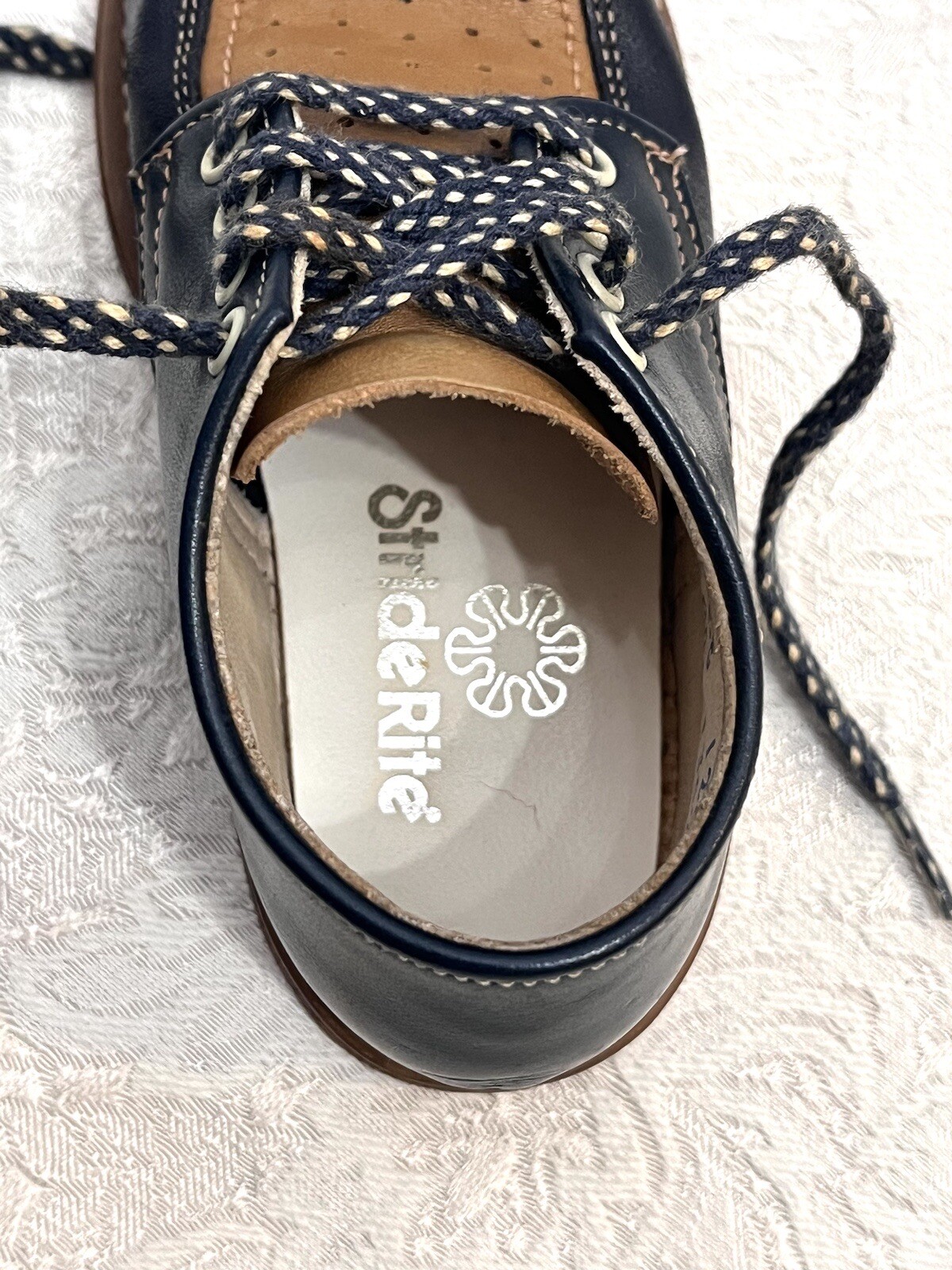 как выглядит Vintage Stride Rite Erin 5 EE Navy Blue Tan Leather Lace Up High Top Shoes EUC фото