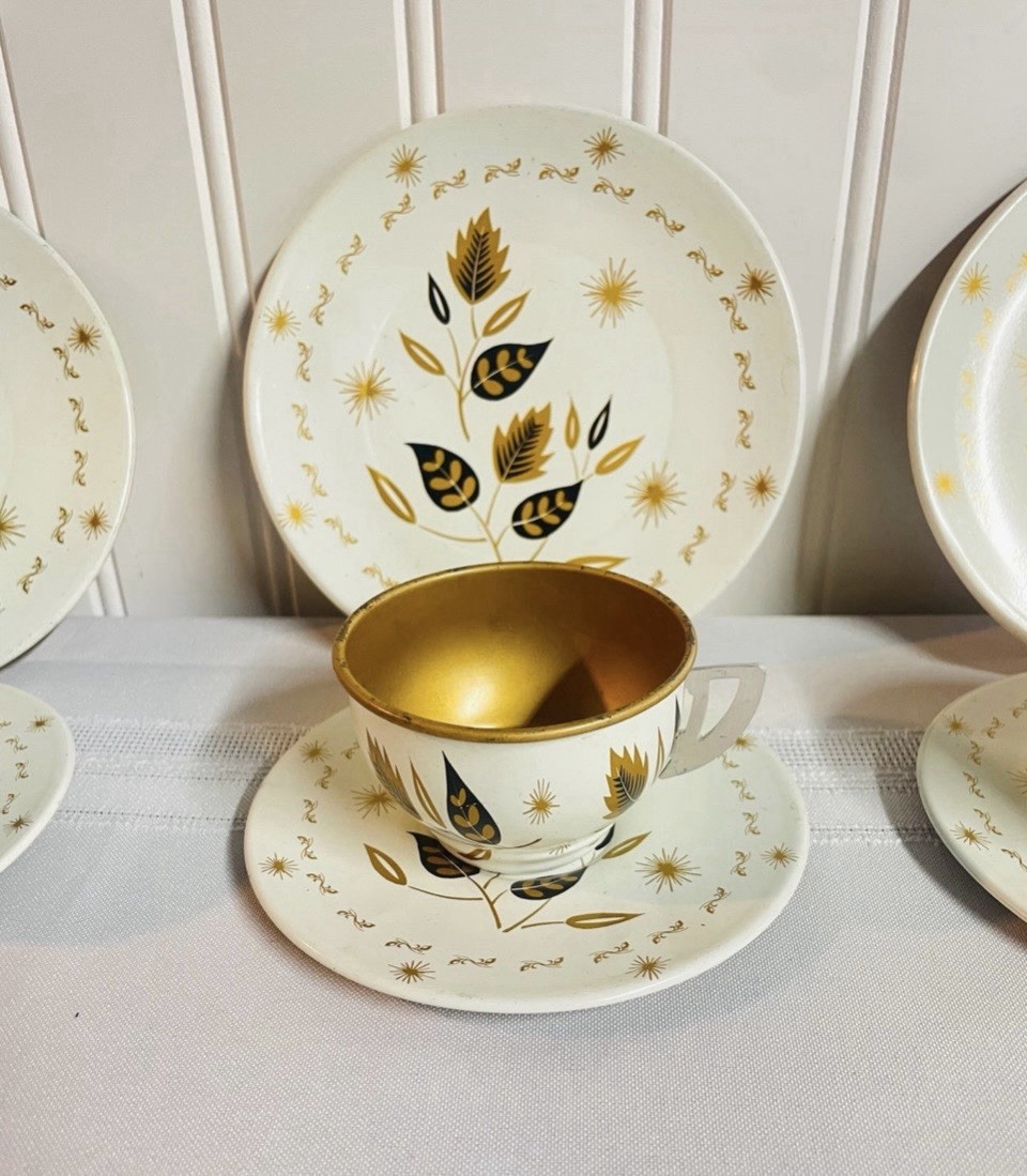 как выглядит Vintage Ohio Art Tin Litho Childs Tea Set Lot of Three 3 Piece Sets фото
