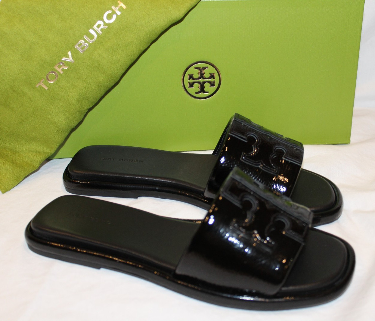 как выглядит Tory Burch Double T Leather Sport Slides Perfect Black NIB SZ 5 фото