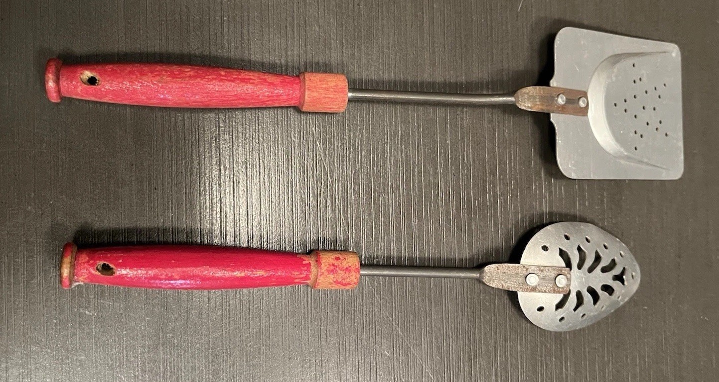 Vintage Toy Aluminum Steel Spatula Slotted Spoon with Red Wooden Handle Wood