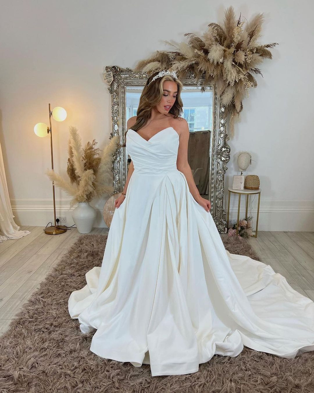 Simple Wedding Dresses V Neck Satin Ruched A Line Sweep Train Bridal Gowns