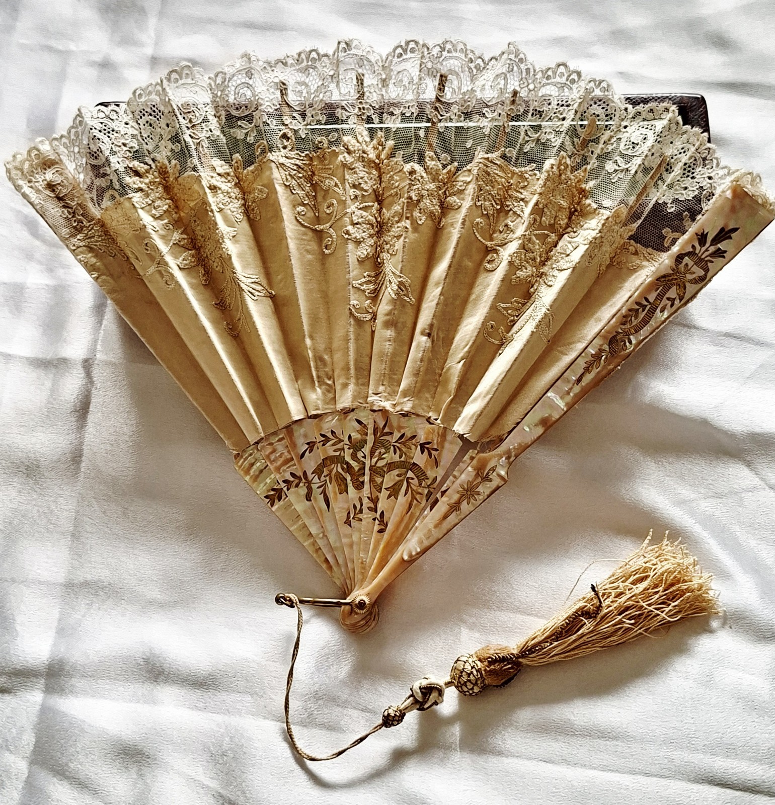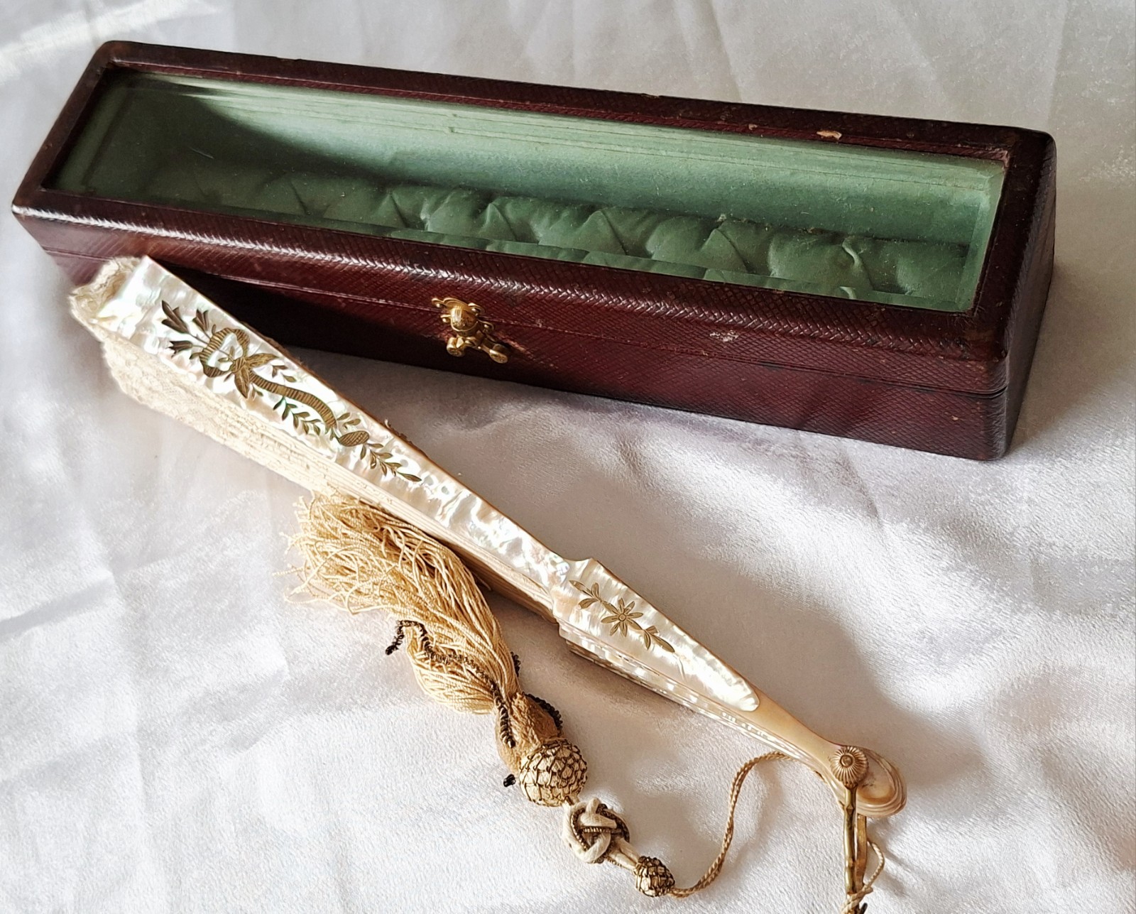 French Mother of Pearl Lace Fan c 1890 Belveled Glass Box Antique Original