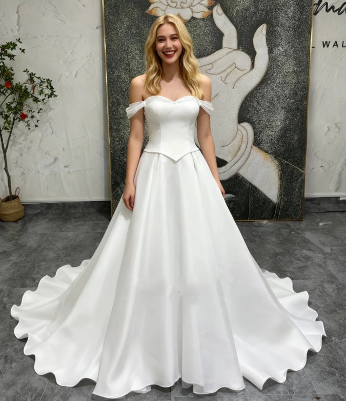 как выглядит Classic Wedding Dresses Off The Shoulder Satin A Line Sweep Train Bridal Gowns фото