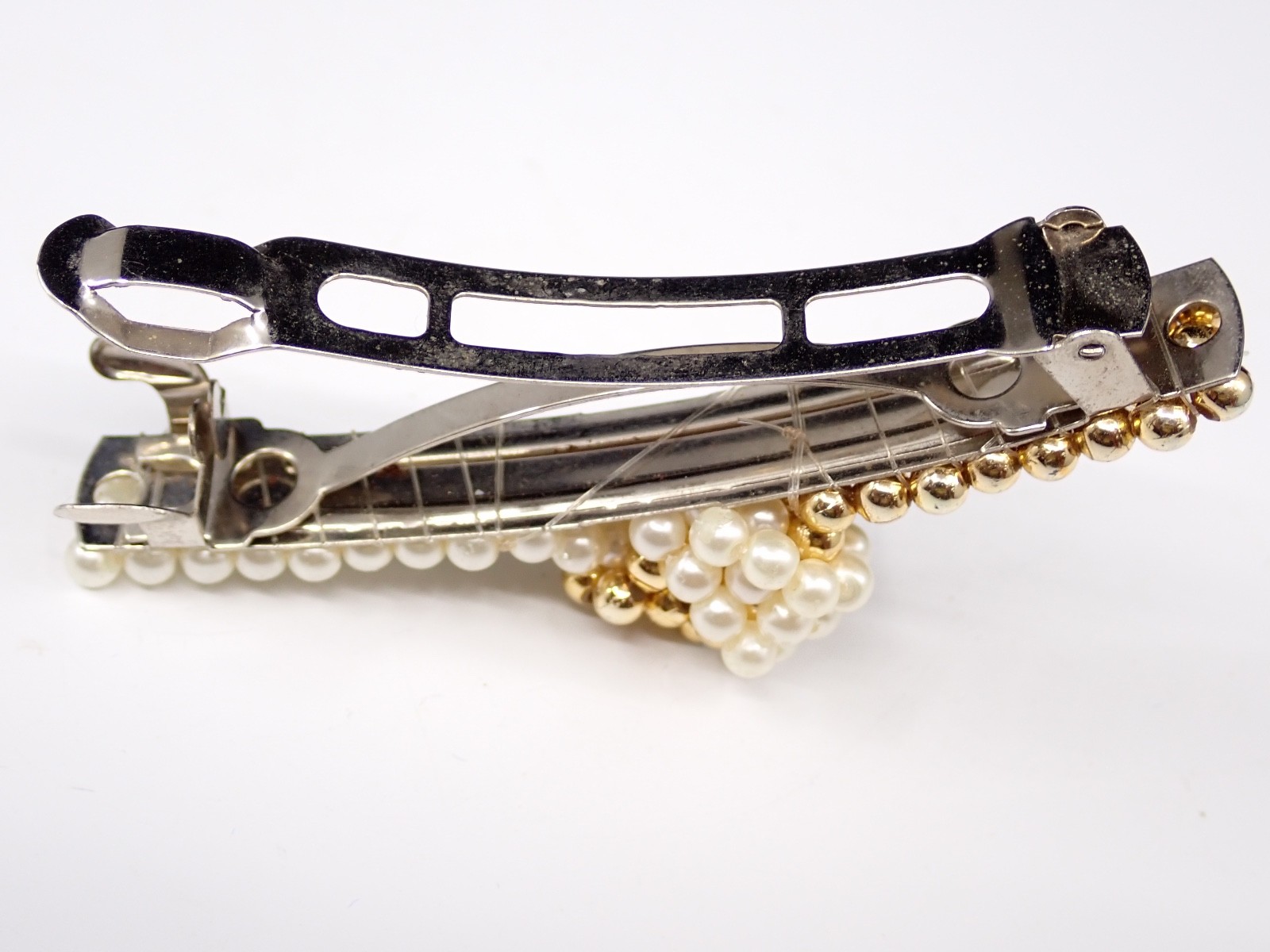 как выглядит Vintage Faux Pearl and Gold Bead Hair Barrette Clip Elegant Beaded Bow Design фото