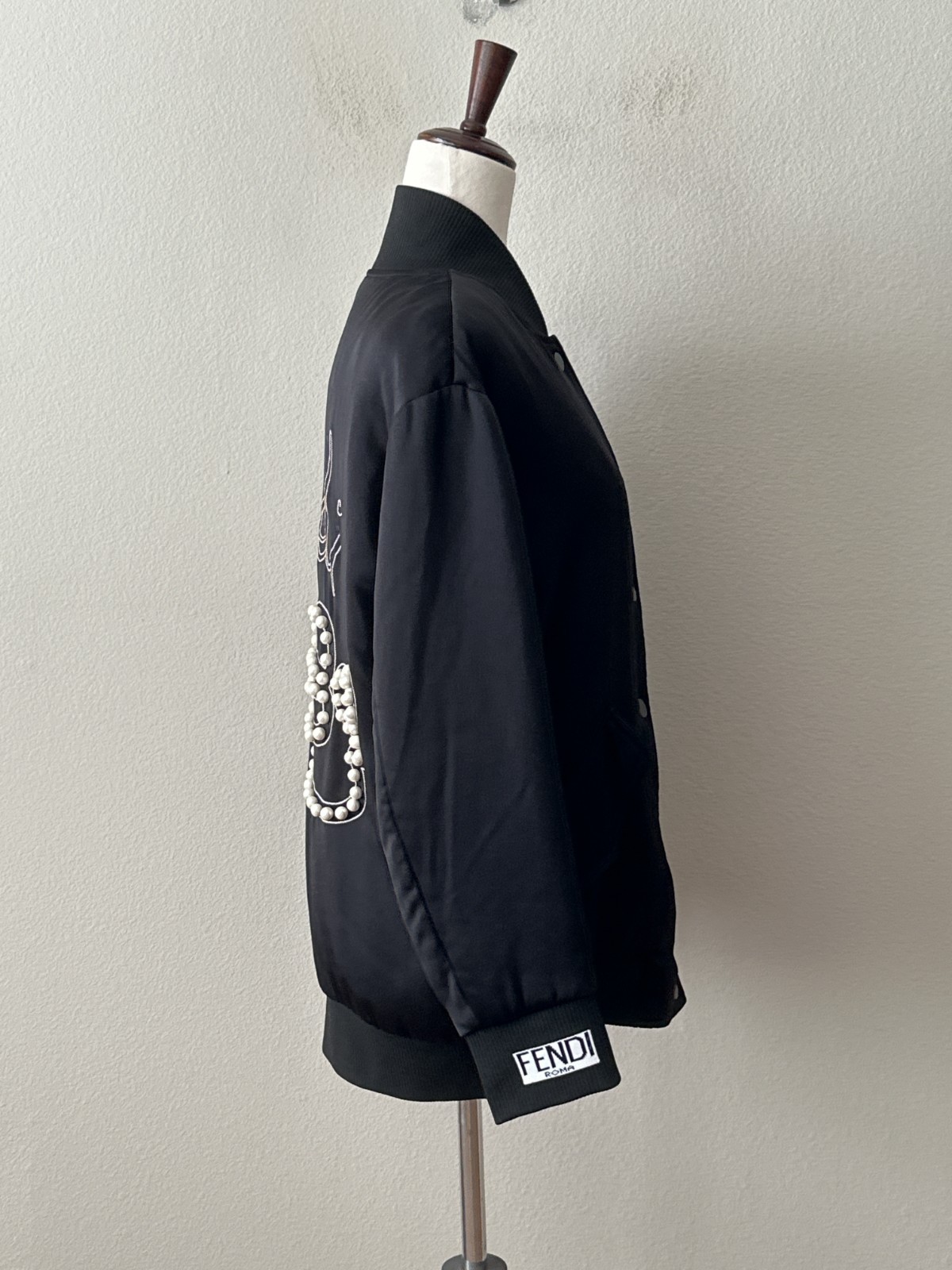 как выглядит Fendi Womens IT 38 / Sz 2 Black Pearls Bow Back Bomber Jacket Rib Knit Cuff Hem фото