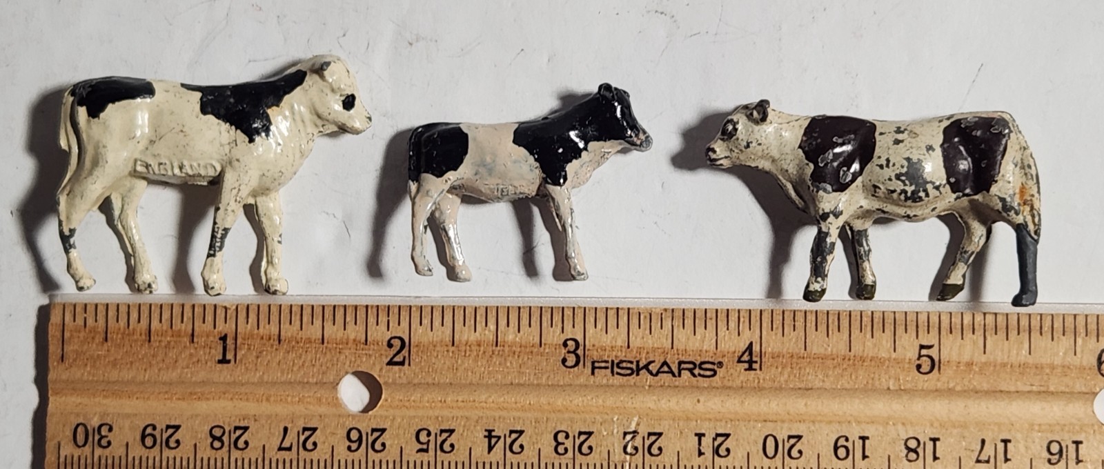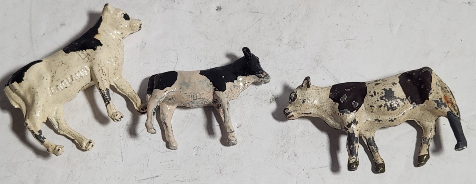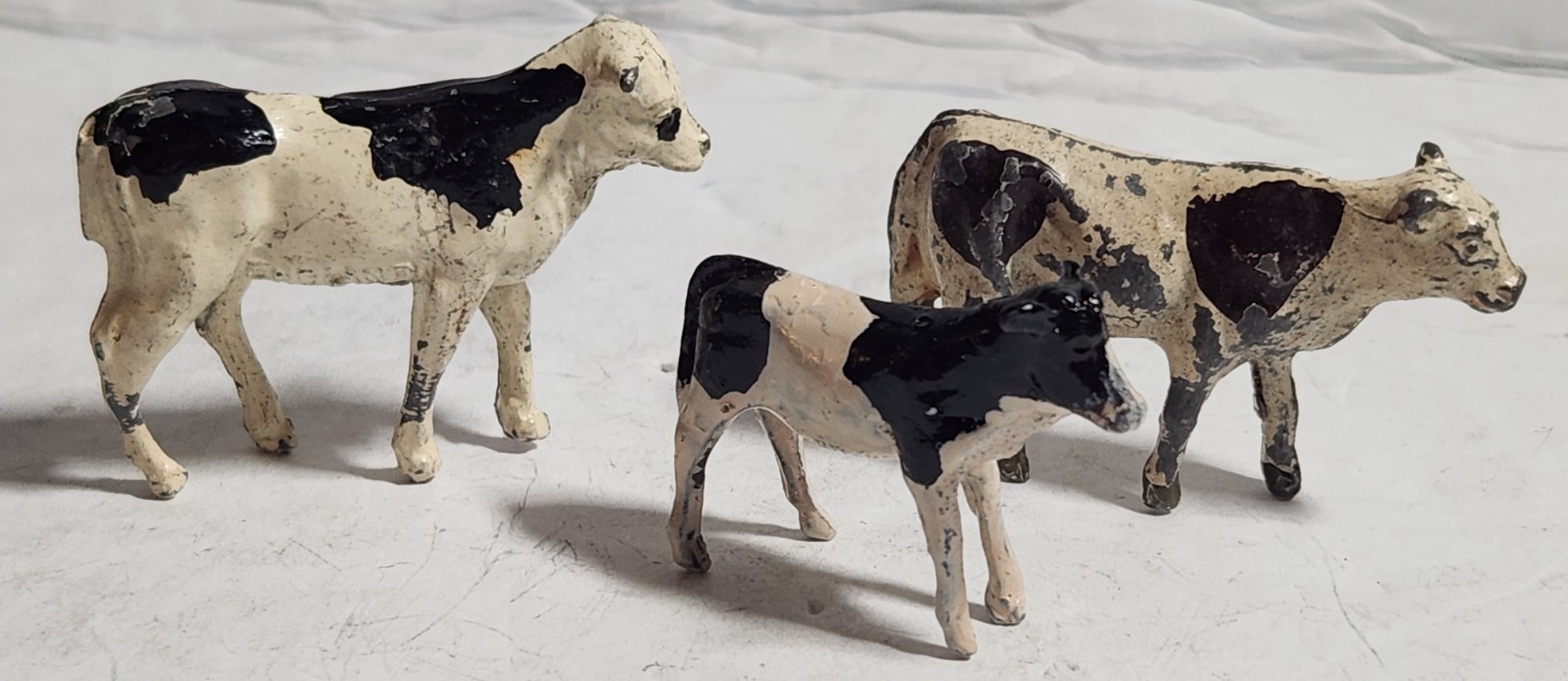 BRITAINS VILLAGE FARM COW CALVES BLACK WHT SET OF 3 LEAD FIGURES VTG ENGLAND