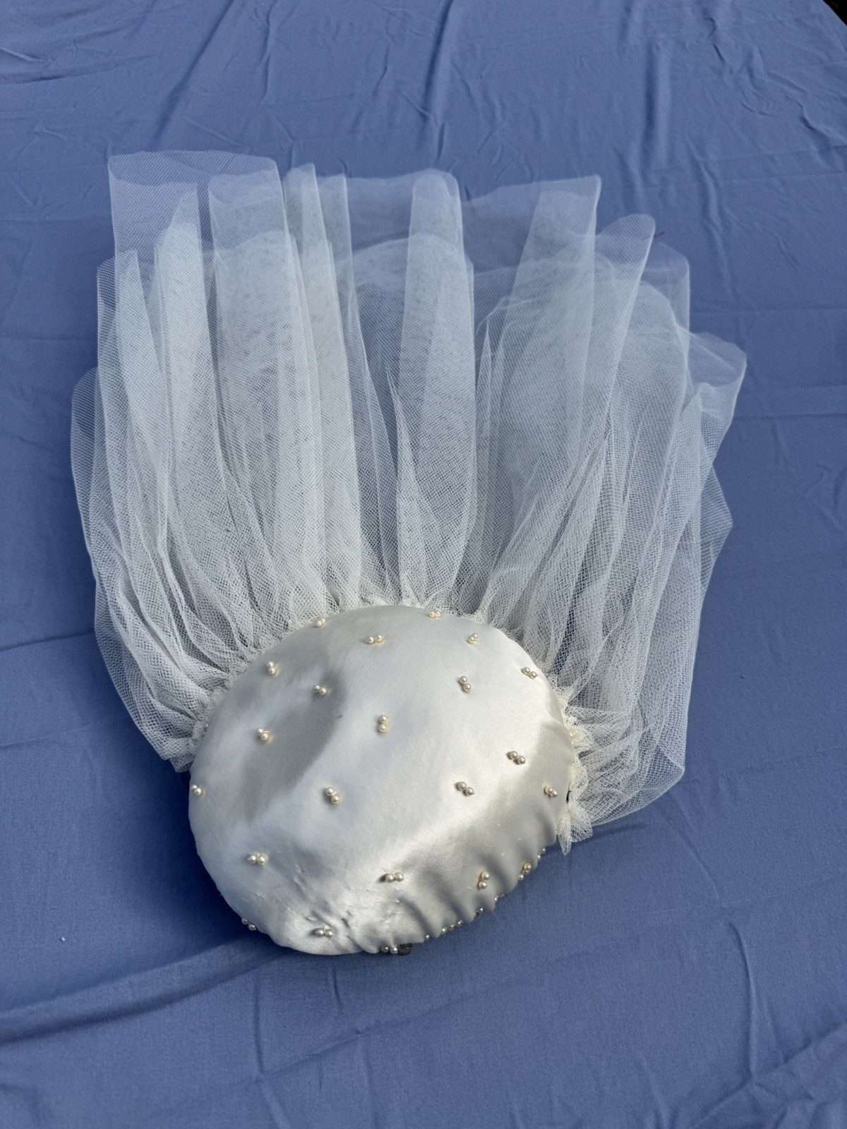 Vintage Bridal Hat Cap Fitted Womens Small Ivory Satin Tulle Veil Pearls 50s 60s