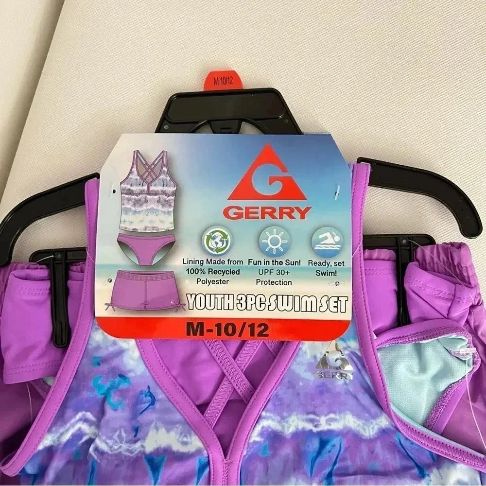 как выглядит Gerry 3-Piece Tankini Shorts Swimsuit Set Size M 10/12 UPF Protection Purple фото