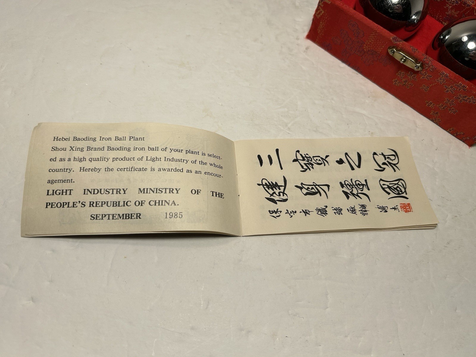 VINTAGE Baoding Balls Chinese Hand Therapy Exercise Balls Stress Relief Red Box