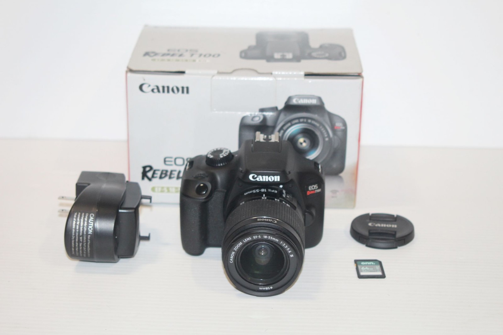 Canon EOS Rebel T100 Digital SLR Camera EF-S 18-55mm Lens 64GB SD- NM w/ Box