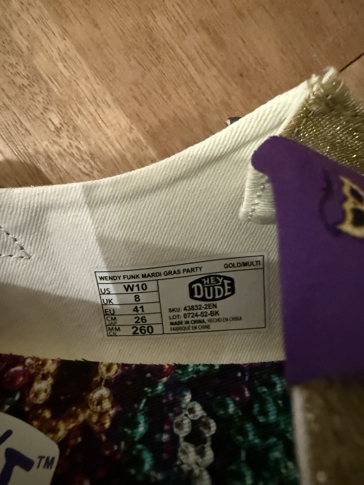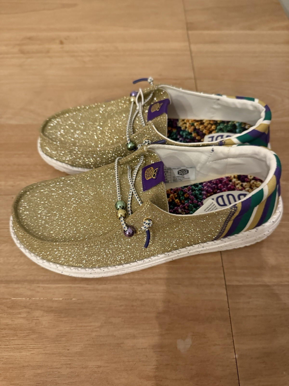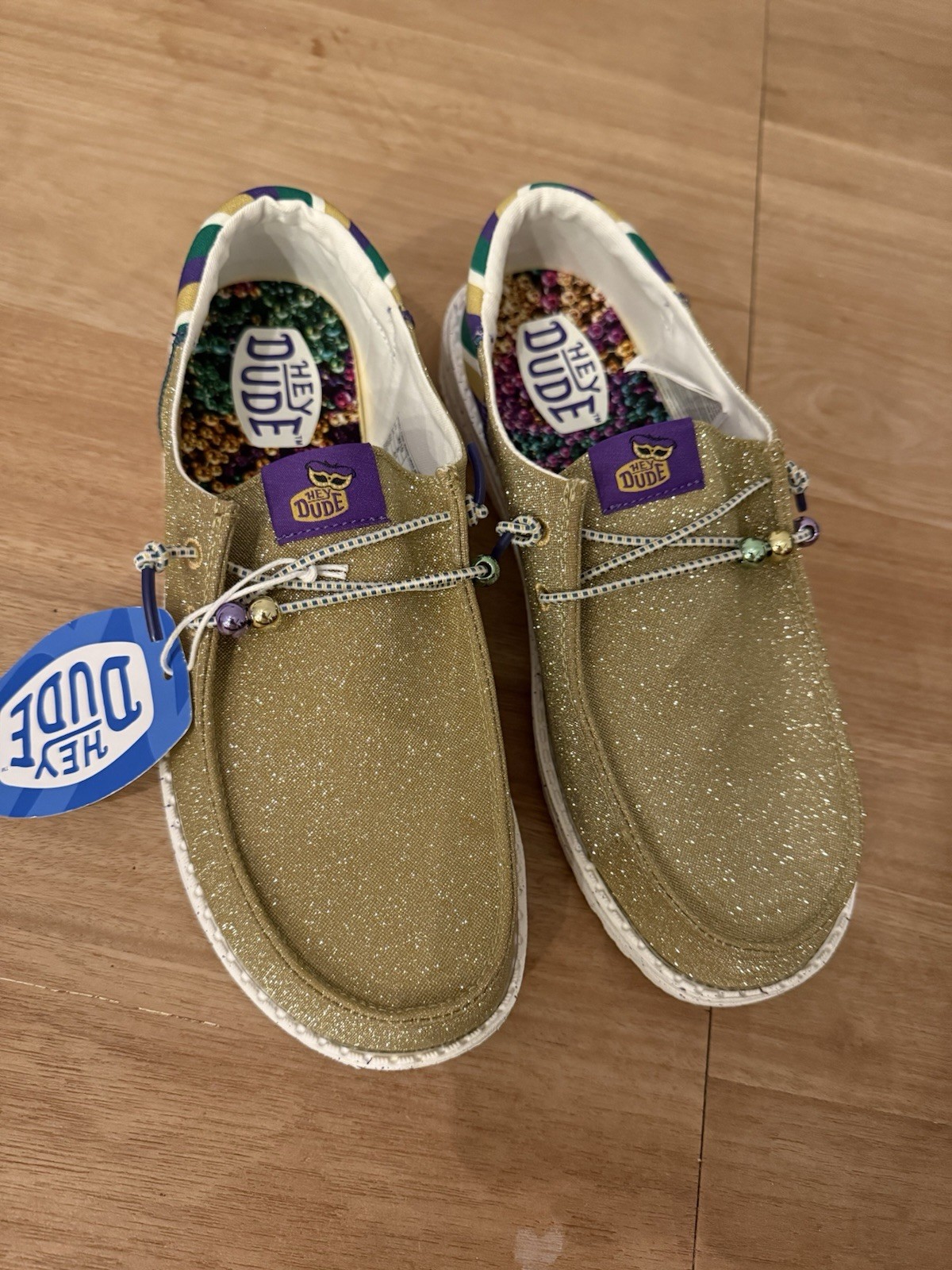 как выглядит HEYDUDE Wendy Funk Mardi Gras Party Gold Glitter Loafers Womens 10 NWT hey dude фото