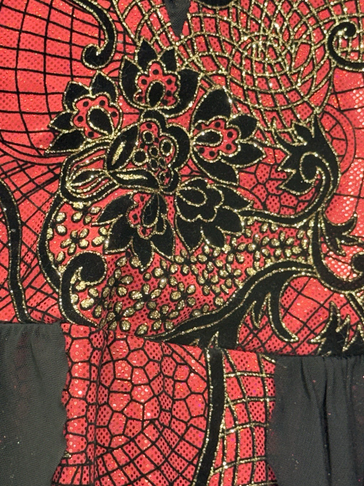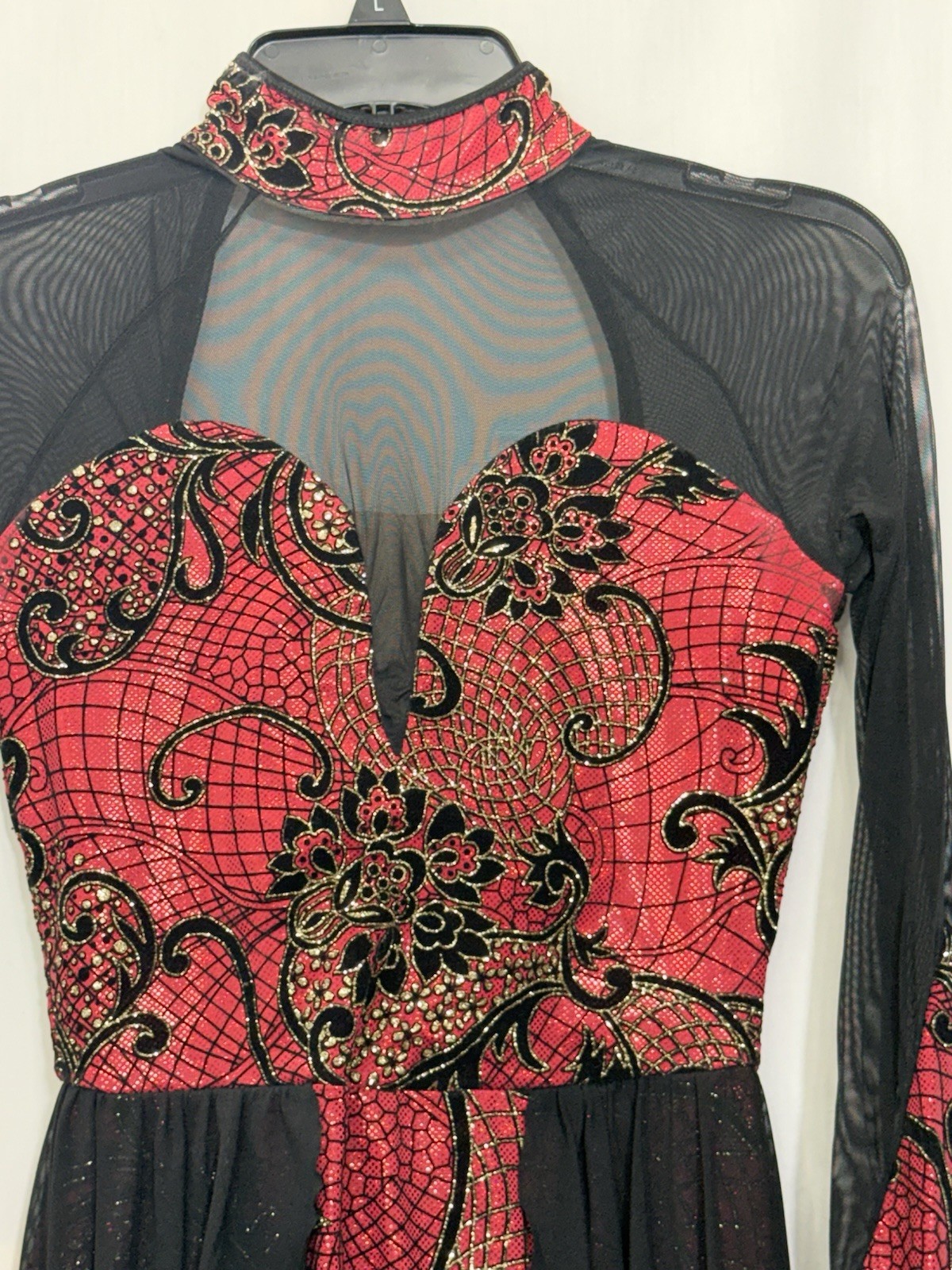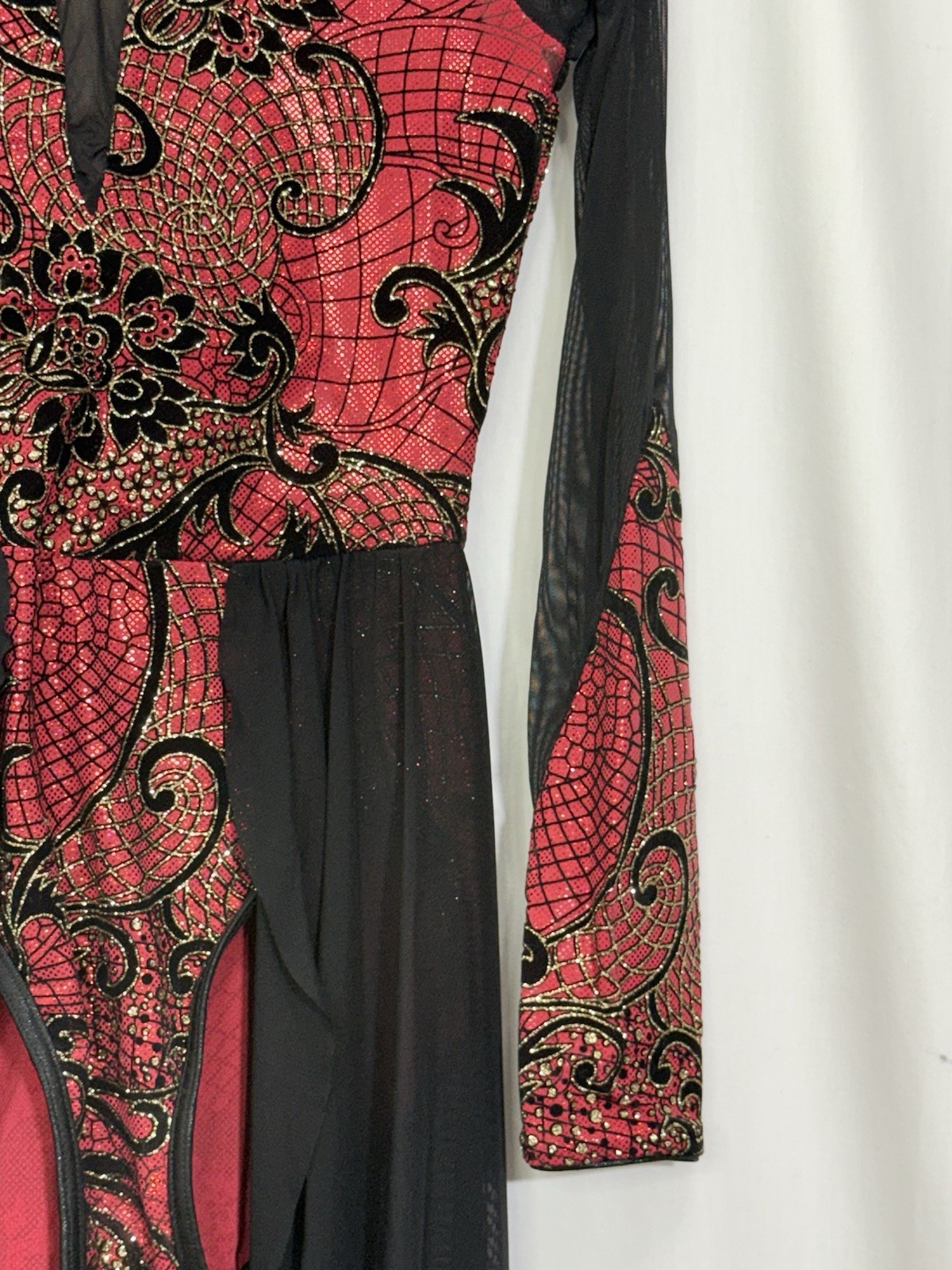 как выглядит Weissman D10408 Sz S Red Metallic Flocked Mesh Long Sleeve Dance Leotard EUC фото