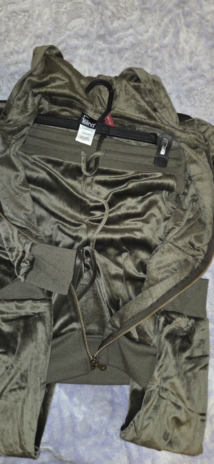 как выглядит Felina Olive Velour Tracksuit Set Hoodie Pants Size S Hooded Zip Pockets фото