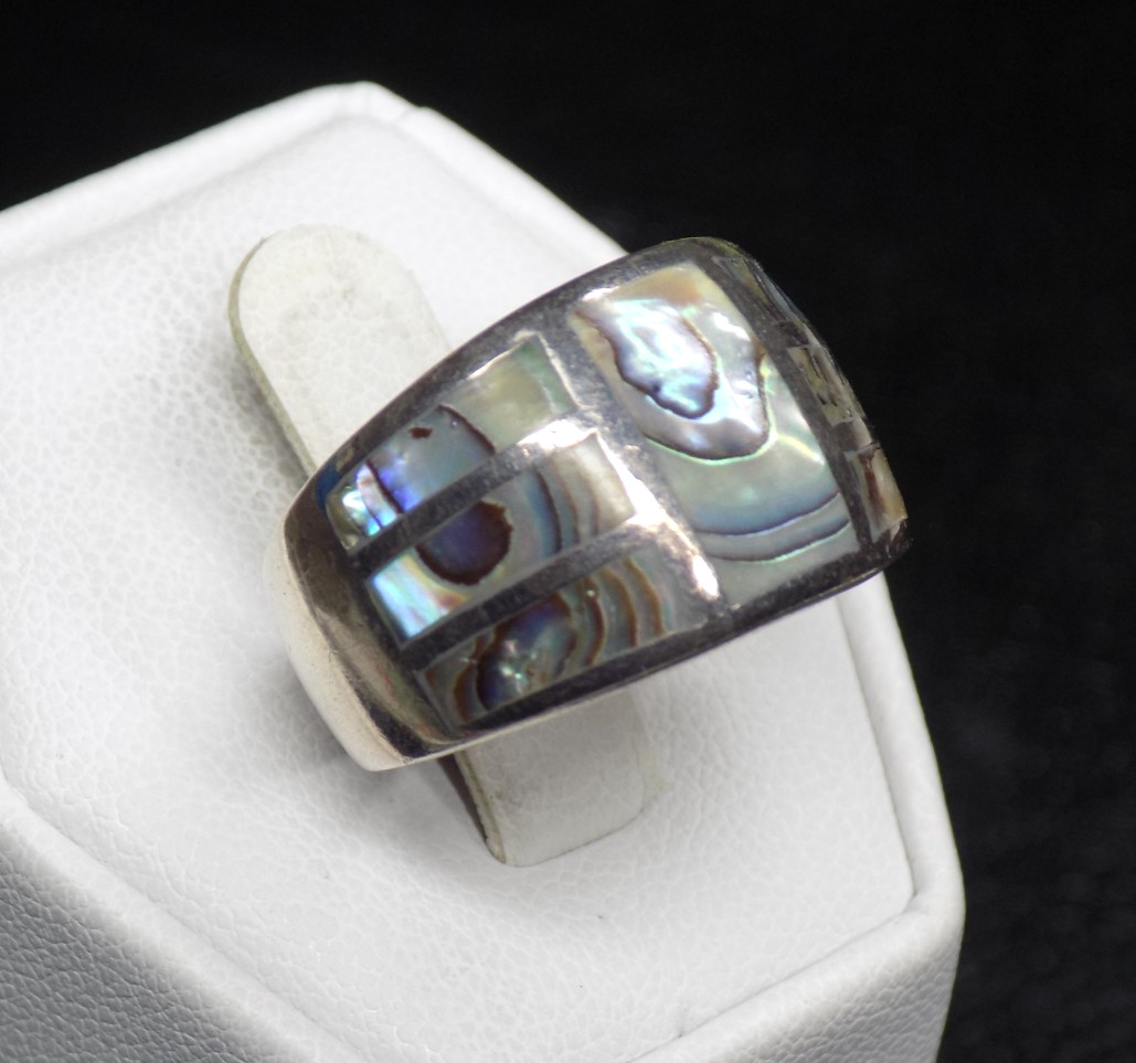 как выглядит Vintage Inlaid Abalone Band Ring 925 Sterling Silver Signed 7.6 grams Size 7 фото