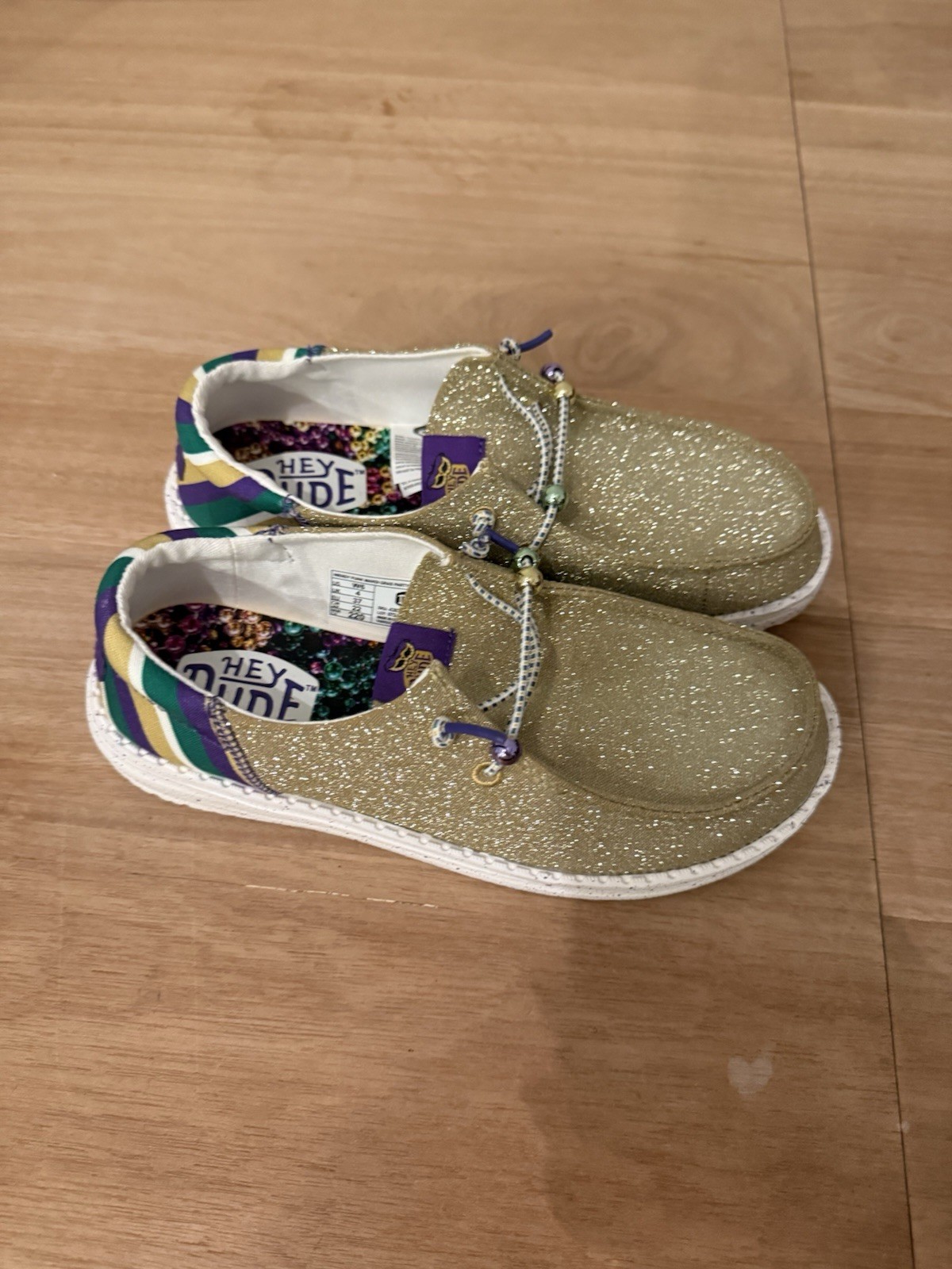 как выглядит HEYDUDE Wendy Funk Mardi Gras Party Gold Glitter Loafers Women 6 NWT hey dude фото