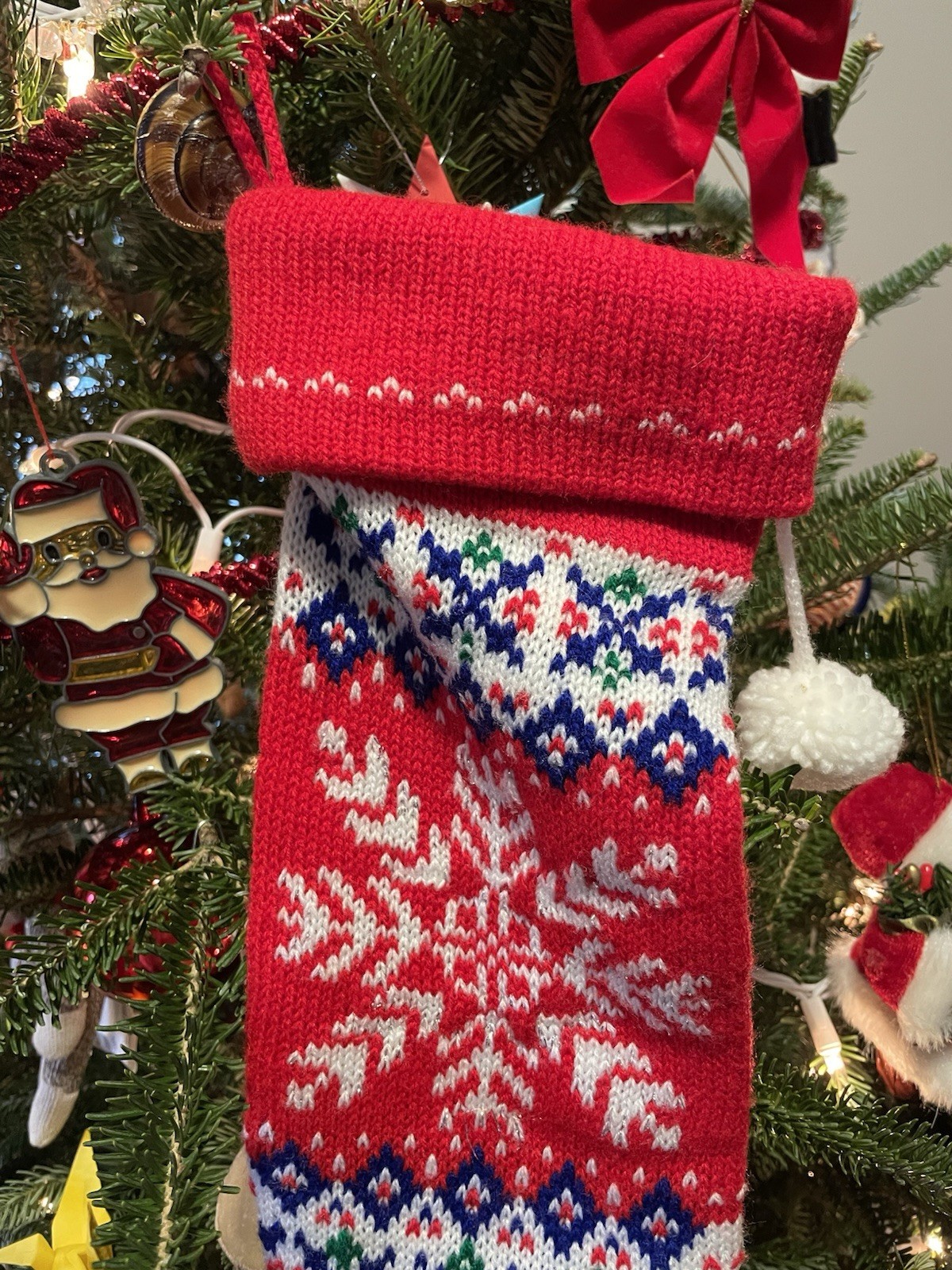 • 2 Vintage Red Christmas Stocking Handmade/Snowflake Reindeer/ Pom Pom
