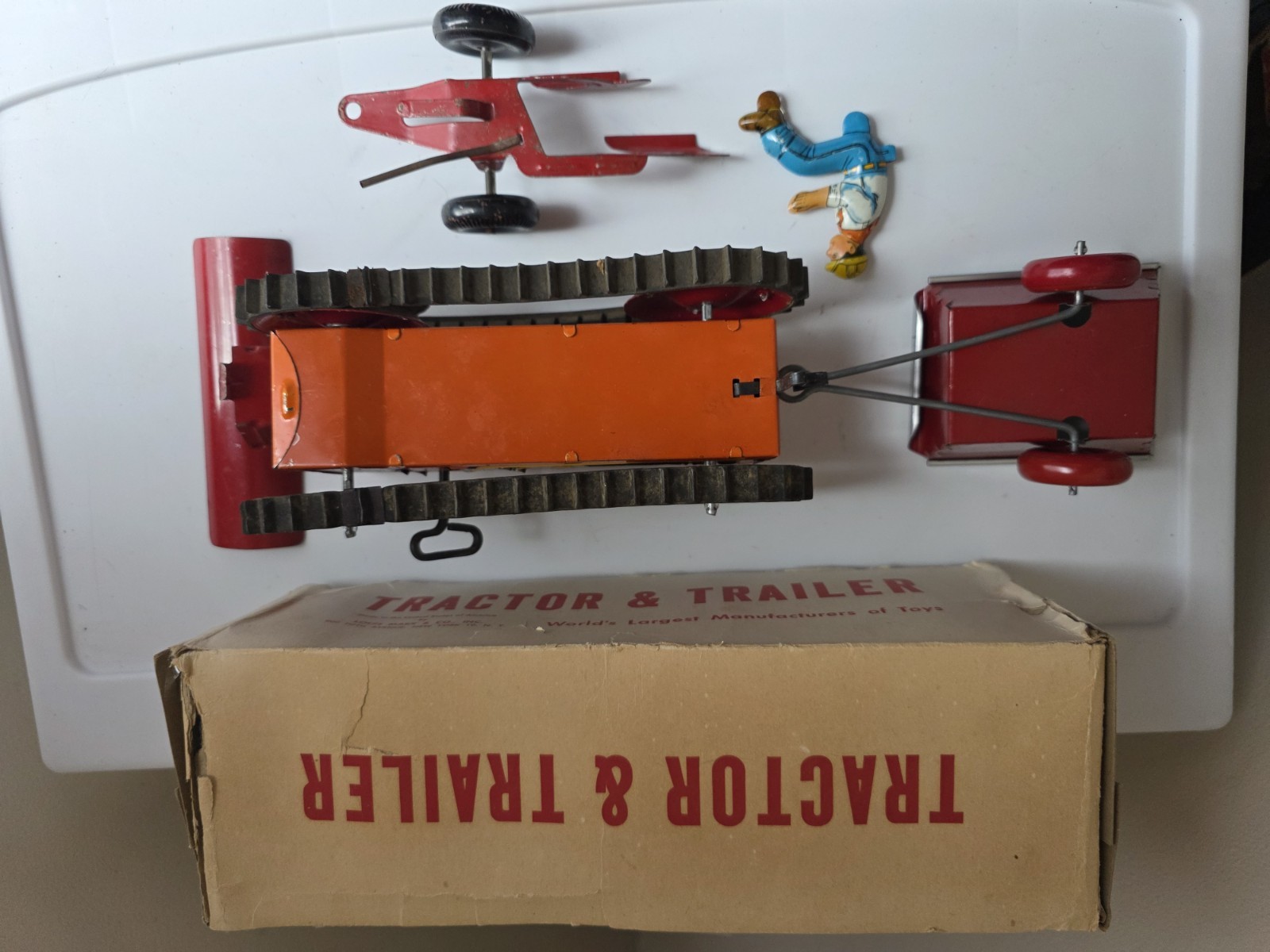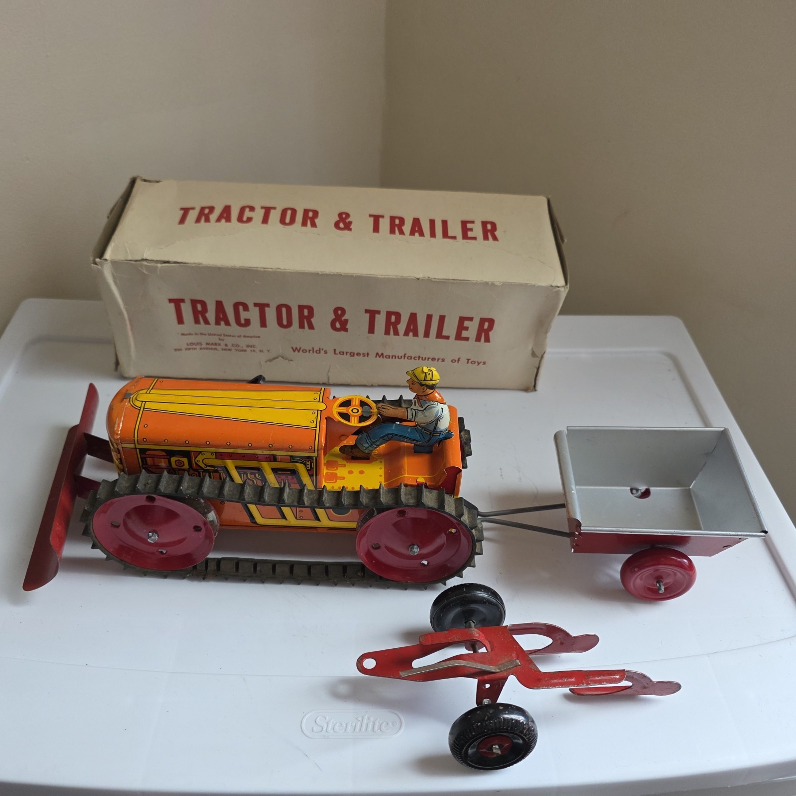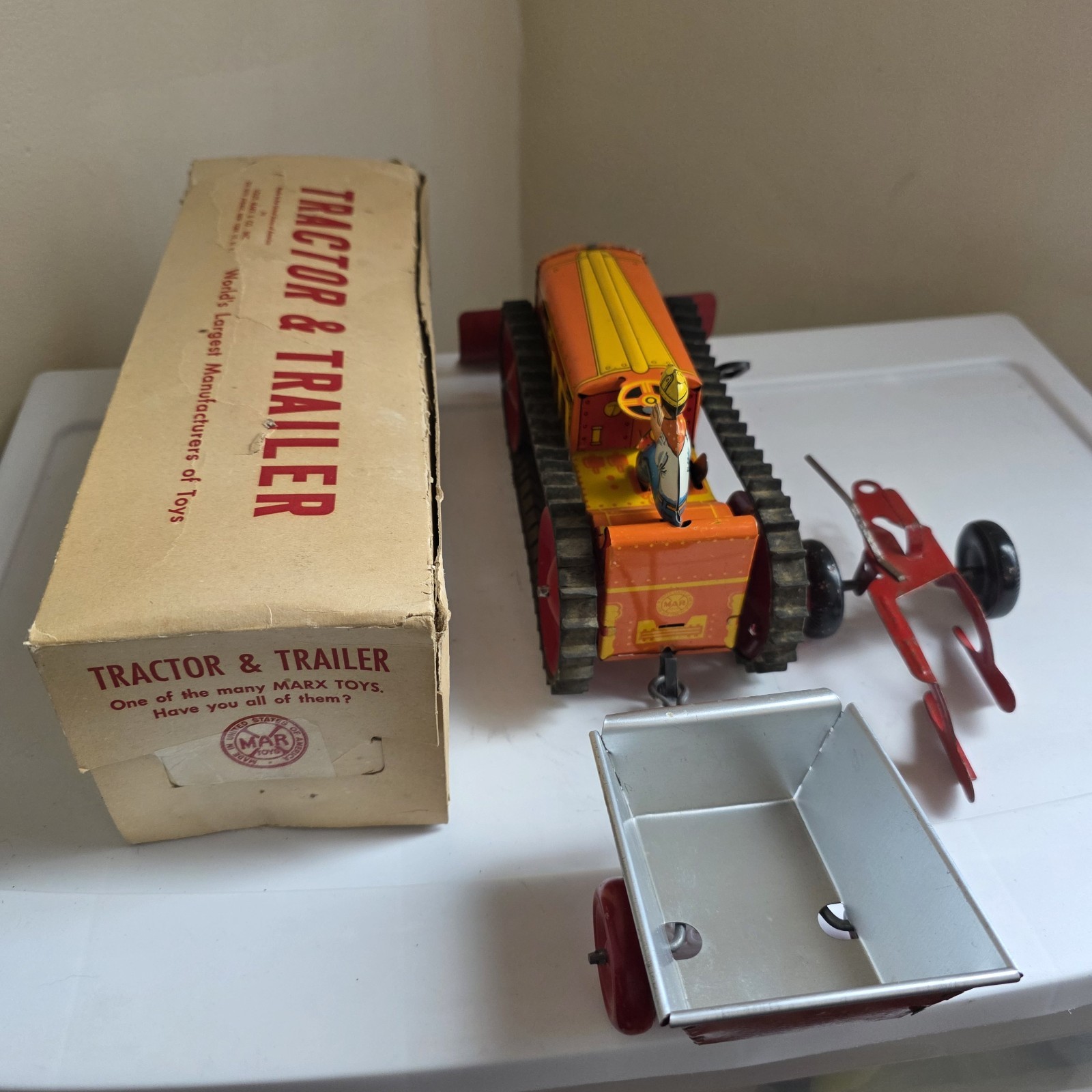 Marx Climbing Tractor With Box, Plow Front And Rear, trailer, Wind Up Works