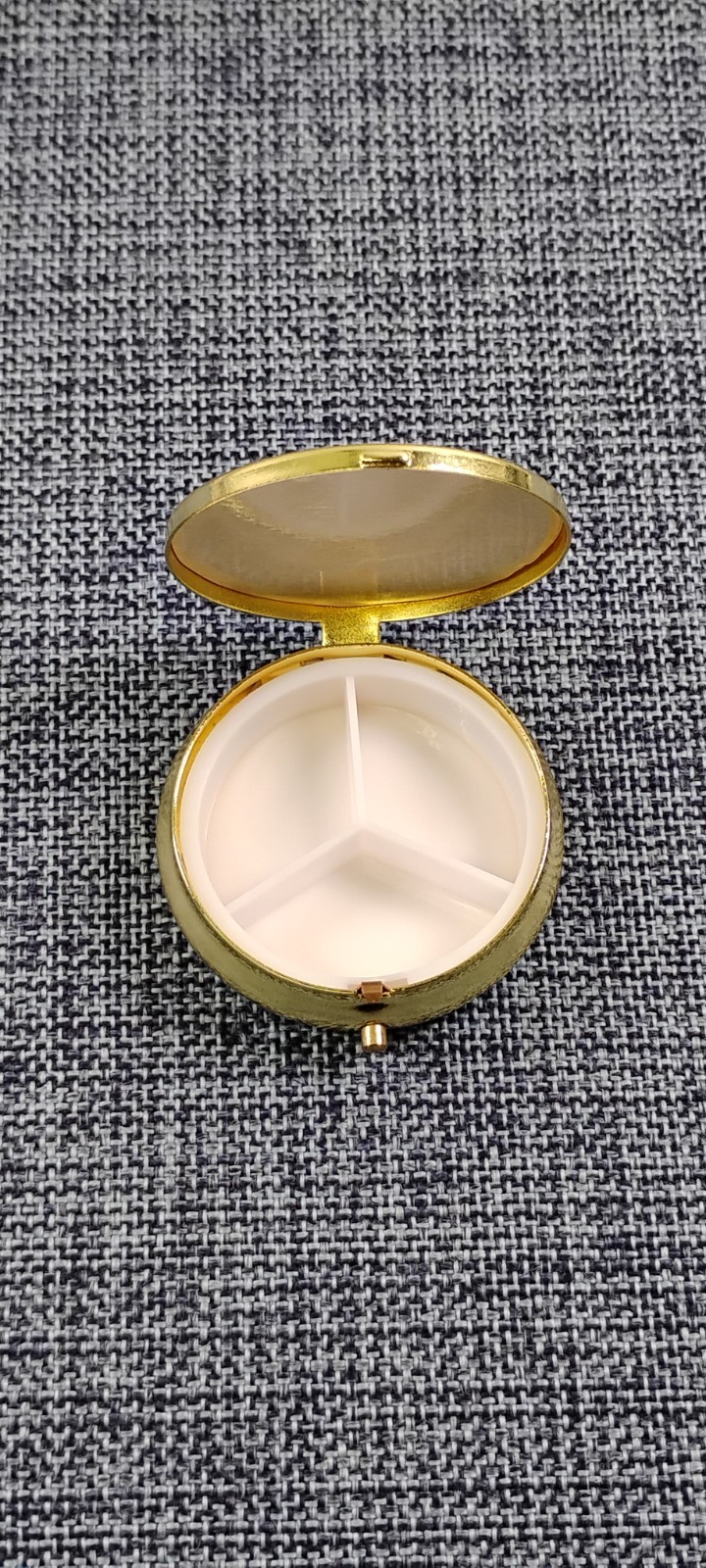 как выглядит Metal Pill Boxes 2in. Round Golden - 3 Compartment Mix Style Lot of 10 фото