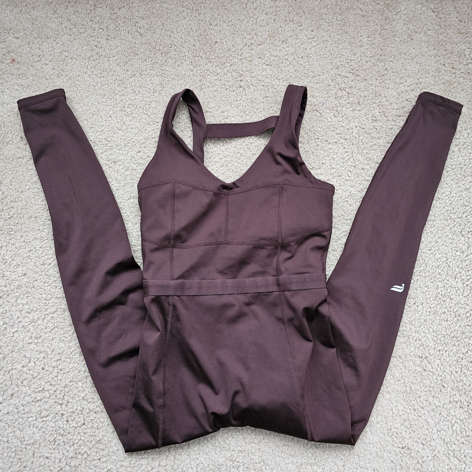 как выглядит Fabletics motion365 one piece jumpsuit chocolate brown open back leggings small фото