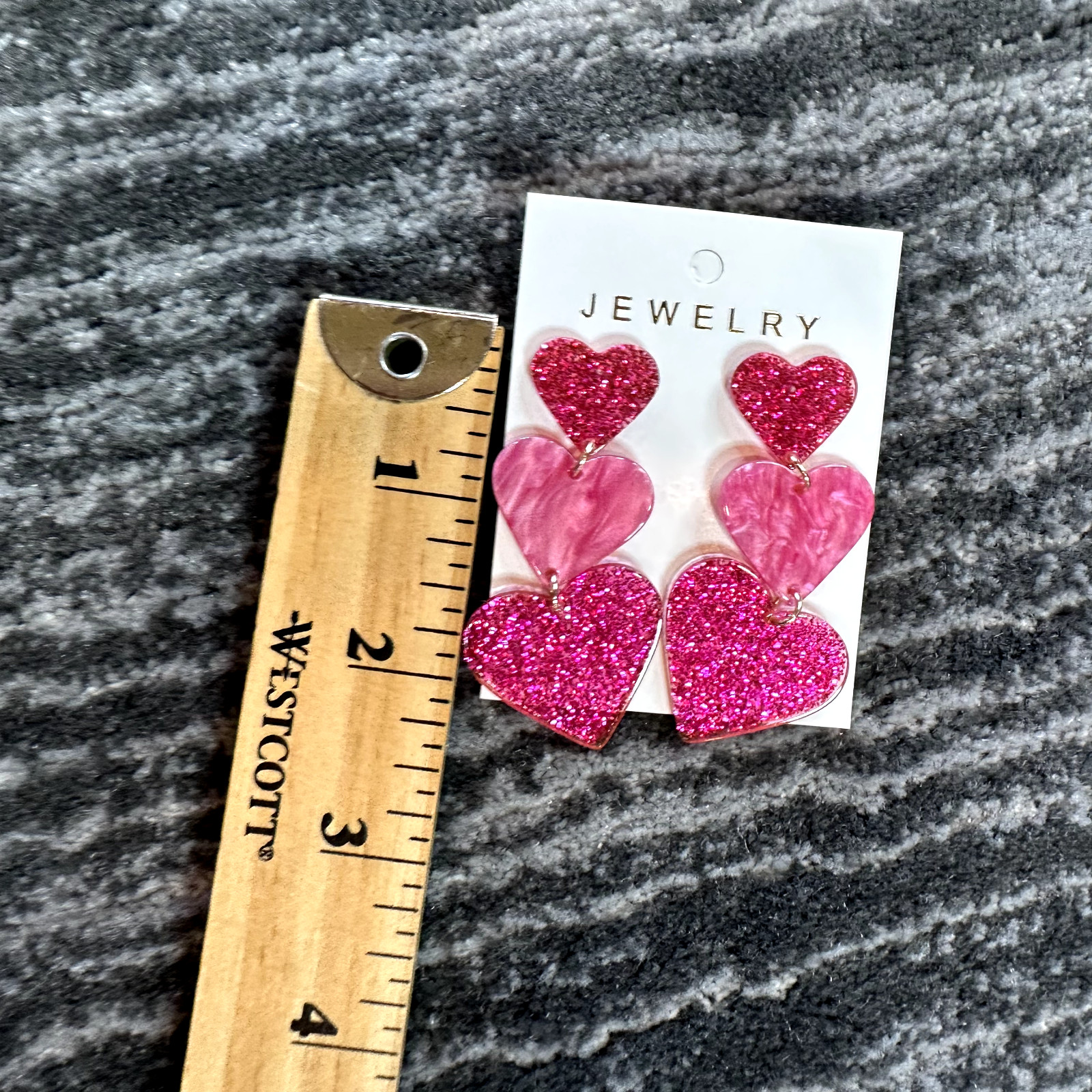 как выглядит Heart Dangle Earrings Three Tier Hot Pink Glitter Valentines Shiny Sparkle Cute фото