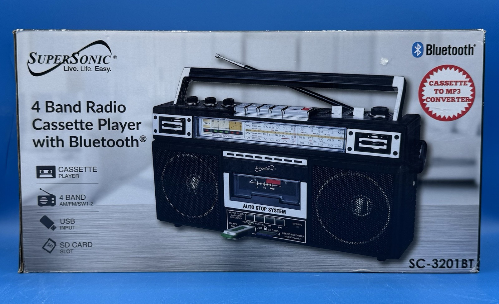 SUPERSONIC SC-3201BT-BK Retro 4 Band Cassette Radio Black w/Bluetooth Open Box