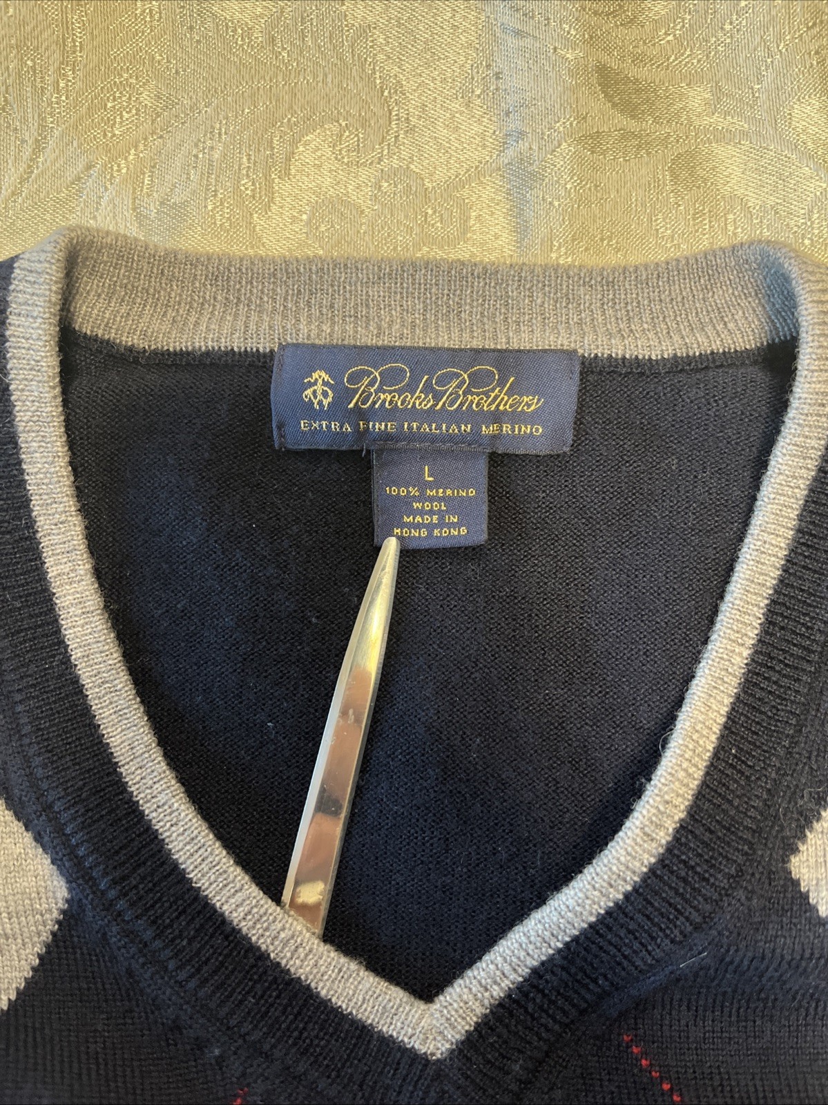 Brooks Brothers Sweater Mens XL Navy Gray Argyle V Neck Italian Merino Wool