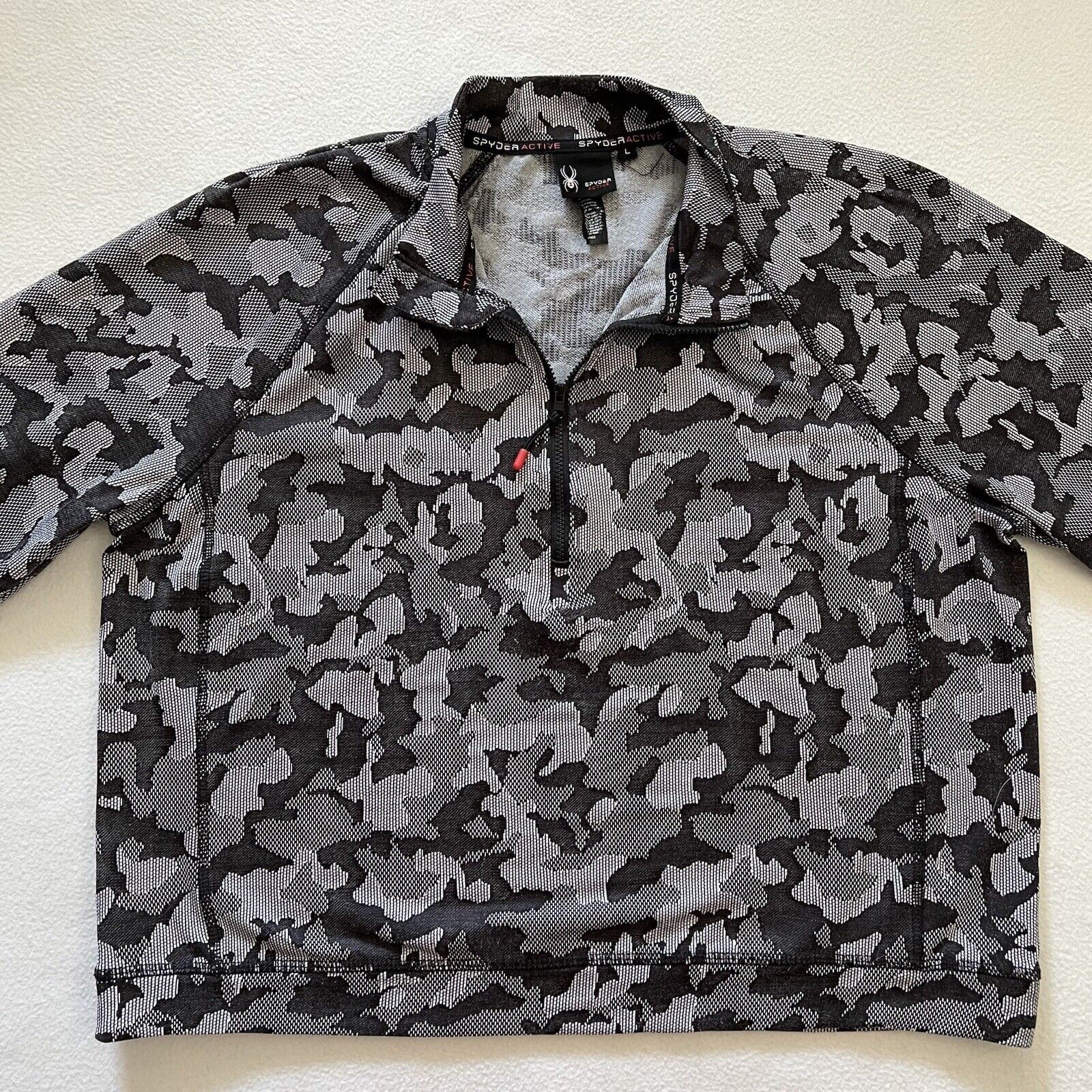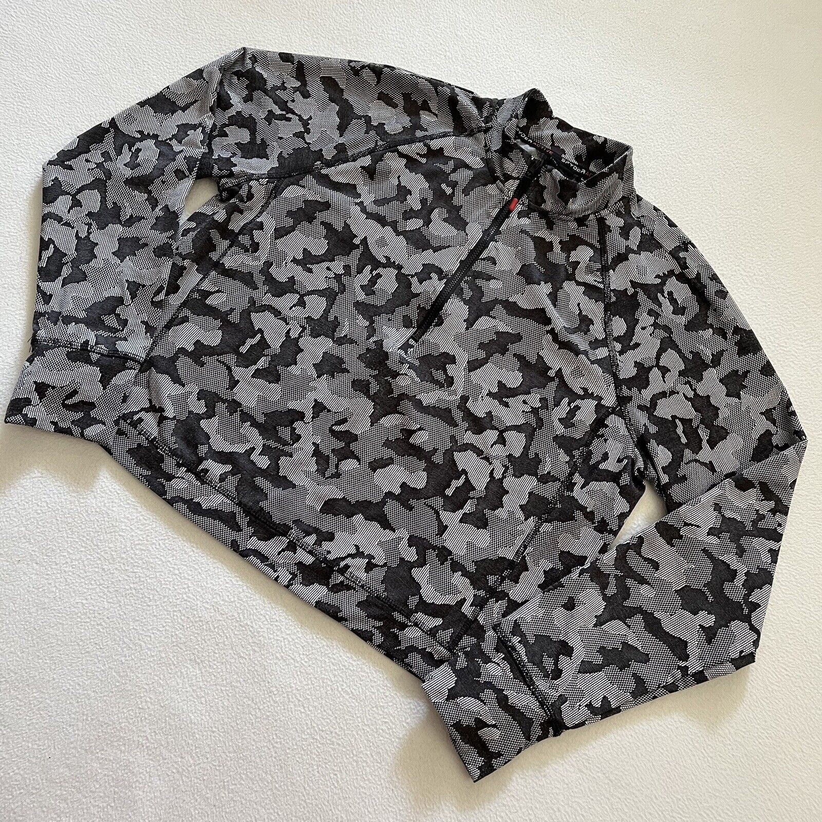как выглядит Spyder Active Black Gray Camo Print Thumbholes Long Sleeve Crop Half Zip Top L фото