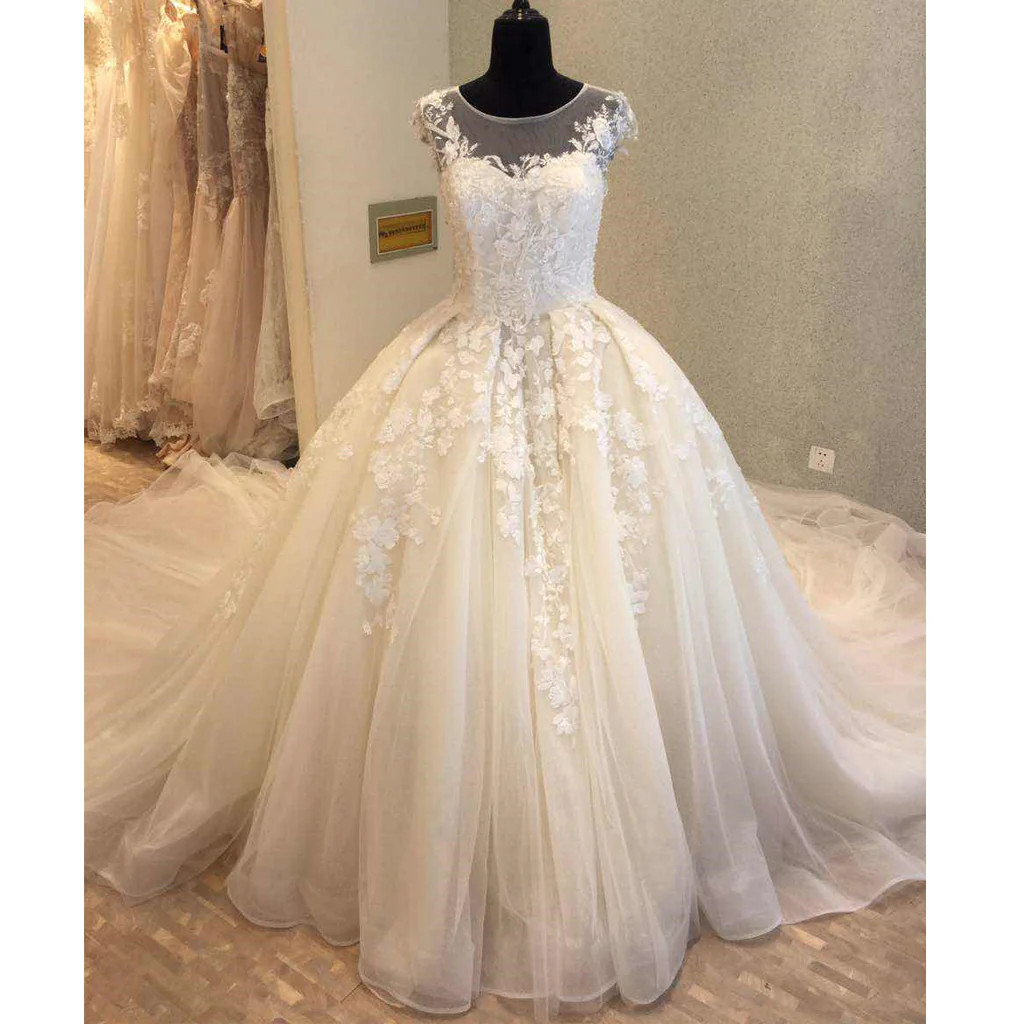 как выглядит Elegant Wedding Dresses Lace Applique Scoop Neck White Ivory A Line Bridal Gowns фото
