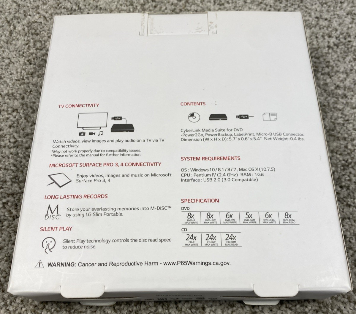 LG Ultra Slim Portable DVD Writer SP80NB80 For Mac Windows New/Open Box