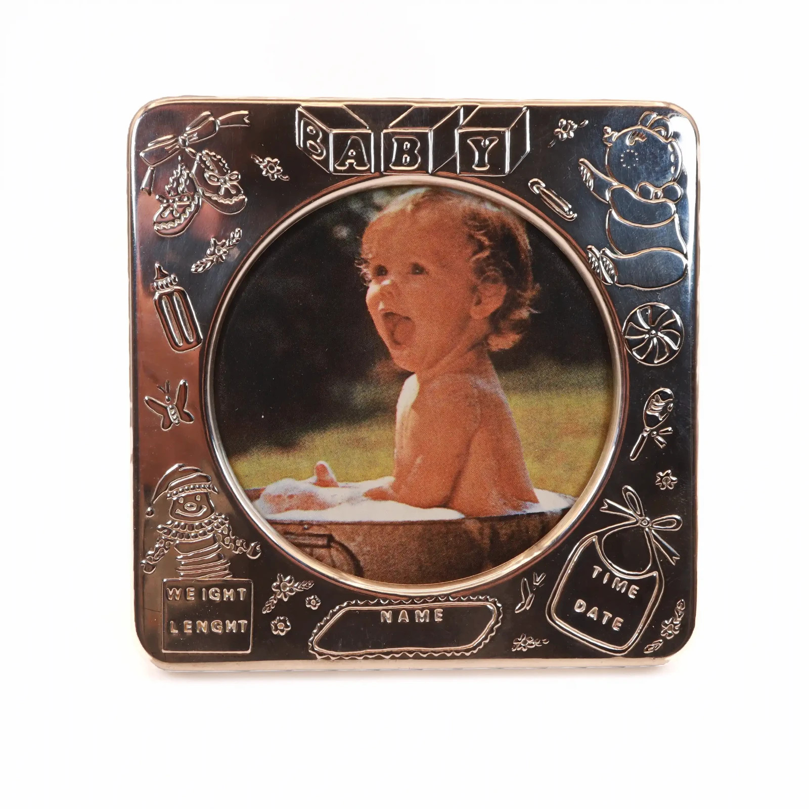 • VTG Silverplate Metal Baby Photo Frame For Personalized Engraving Birth Record