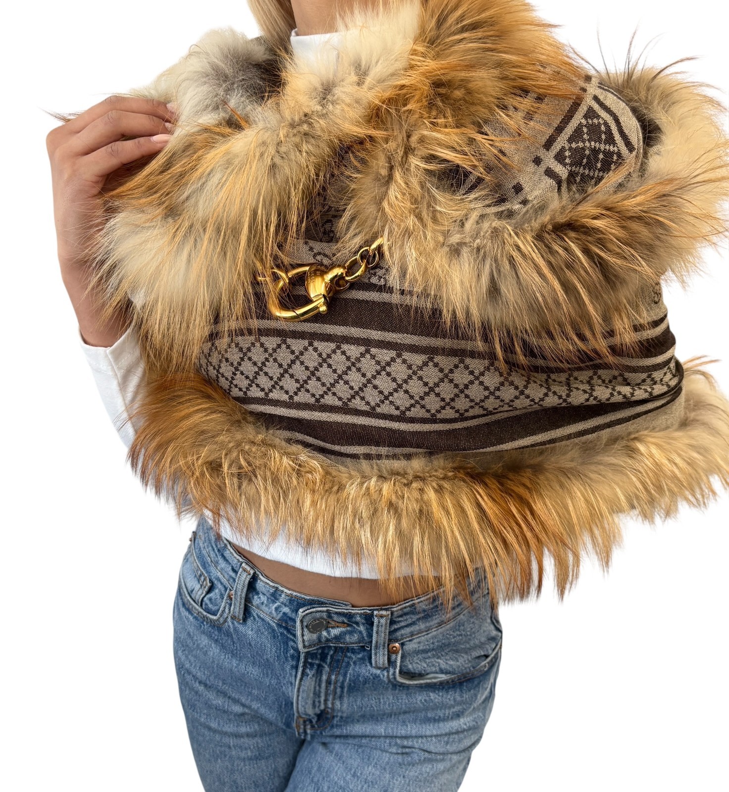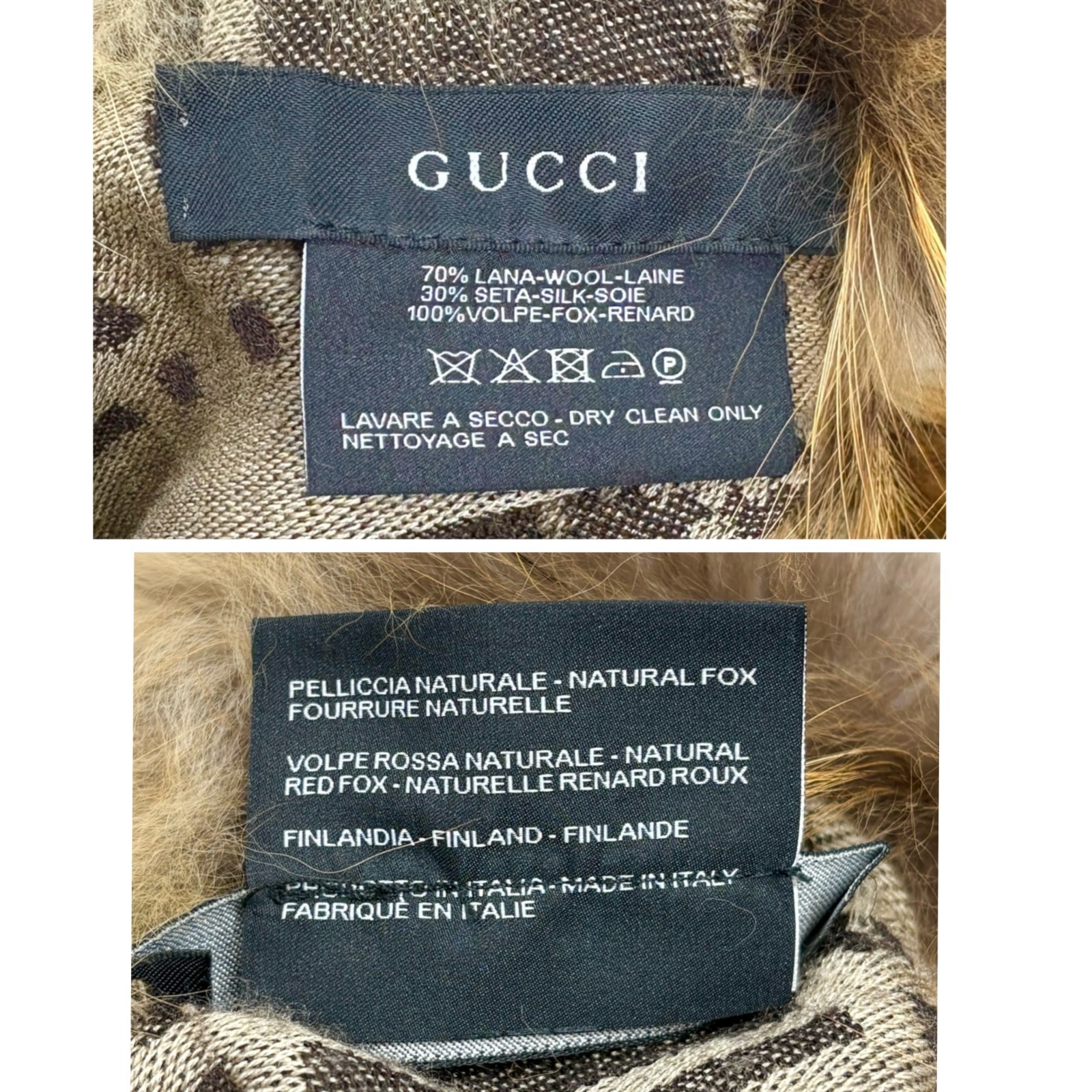 GUCCI Vintage GG Monogram Fox Fur Snap Hook Shawl Scarf Wrap Brown Silk