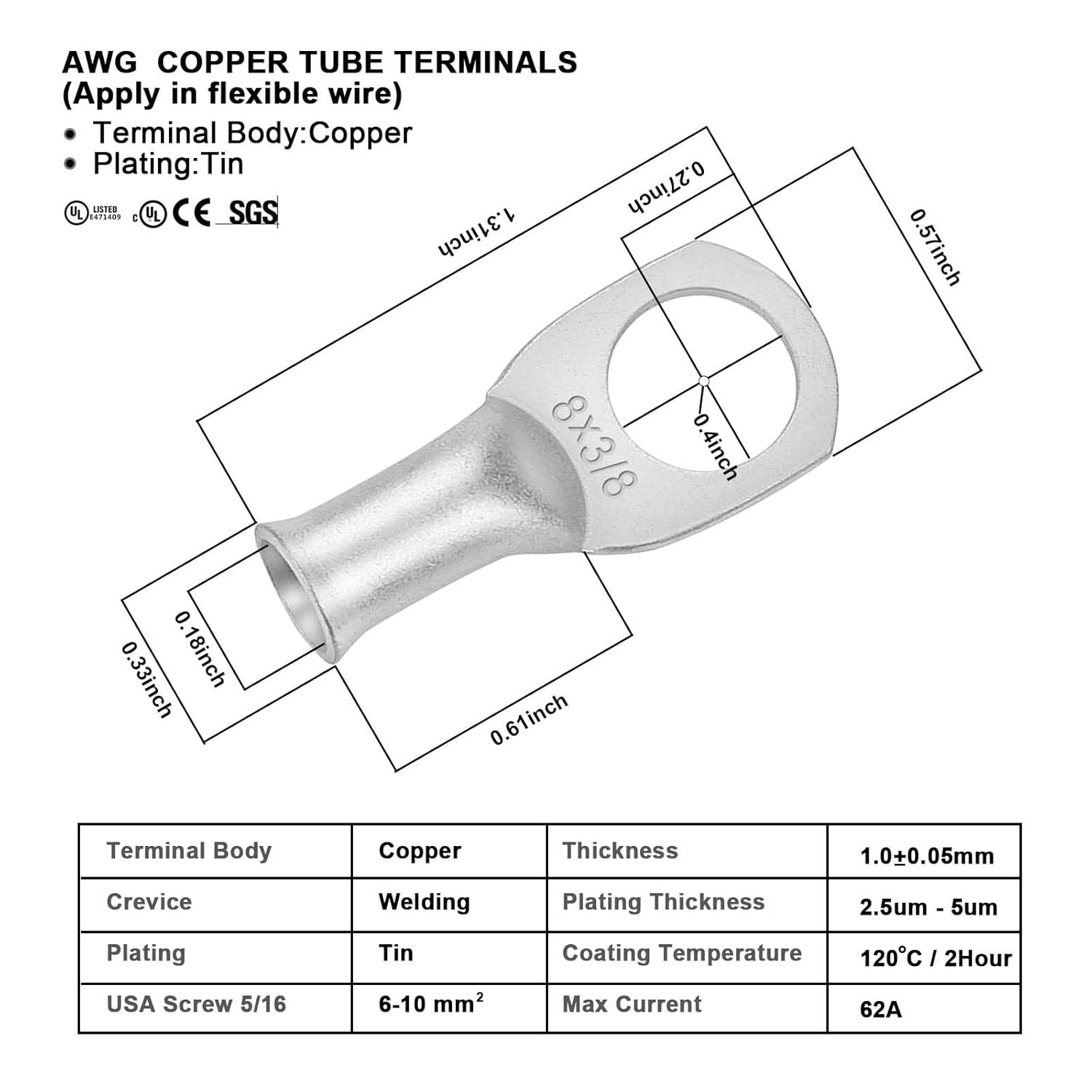 8 AWG Battery Cable Tinned Copper Wire with Terminals for Solar RV Marine 2Ft