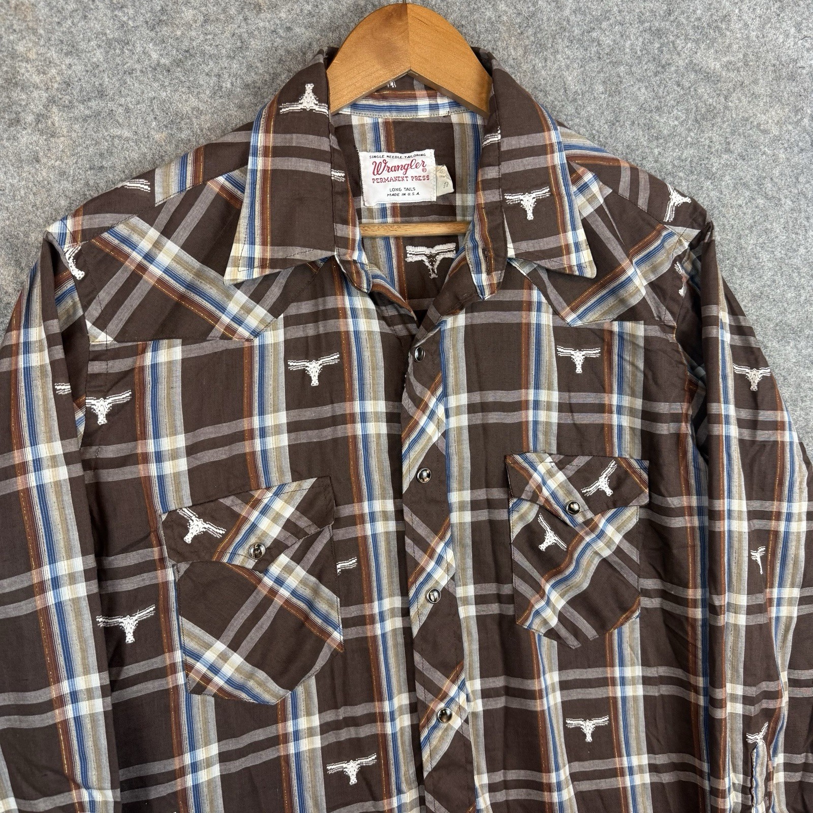 VTG Wrangler Shirt Mens 16.5 Permanent Press Long Tails Bull AOP Pearl Snap 70s