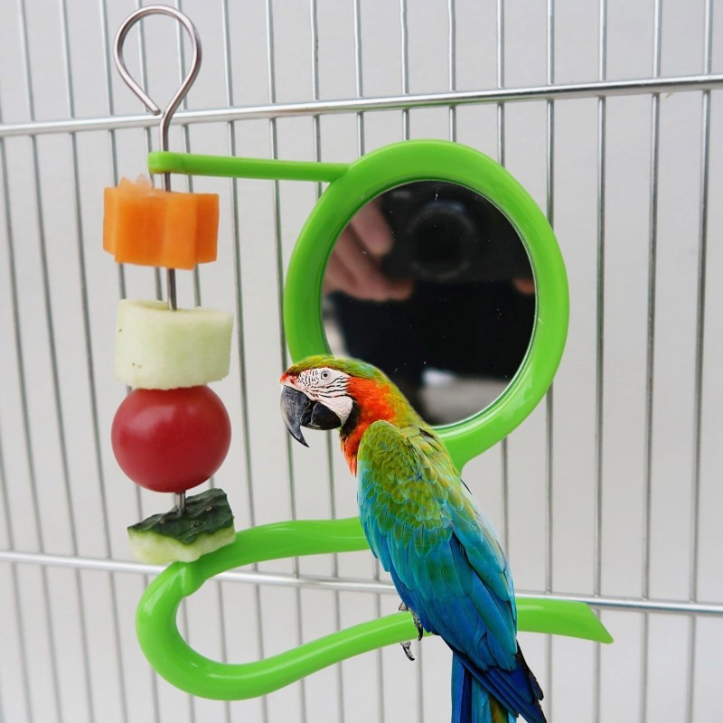 Parrot Mirror Toys for Cage Hanging Bird Feeder with Plastic Perch Fruit Holder