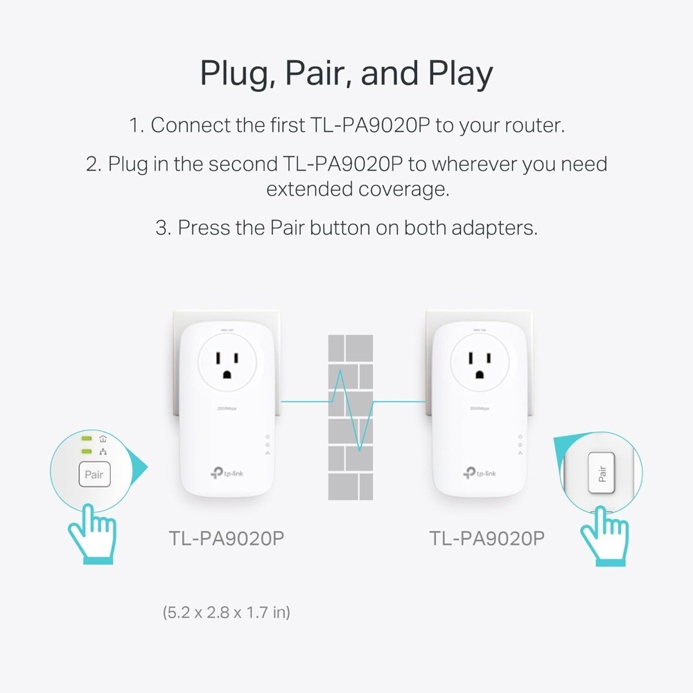 Powerline Ethernet Adapter Kit with Passthrough 2x2 MIMO 2 Gigabit Ports Plug
