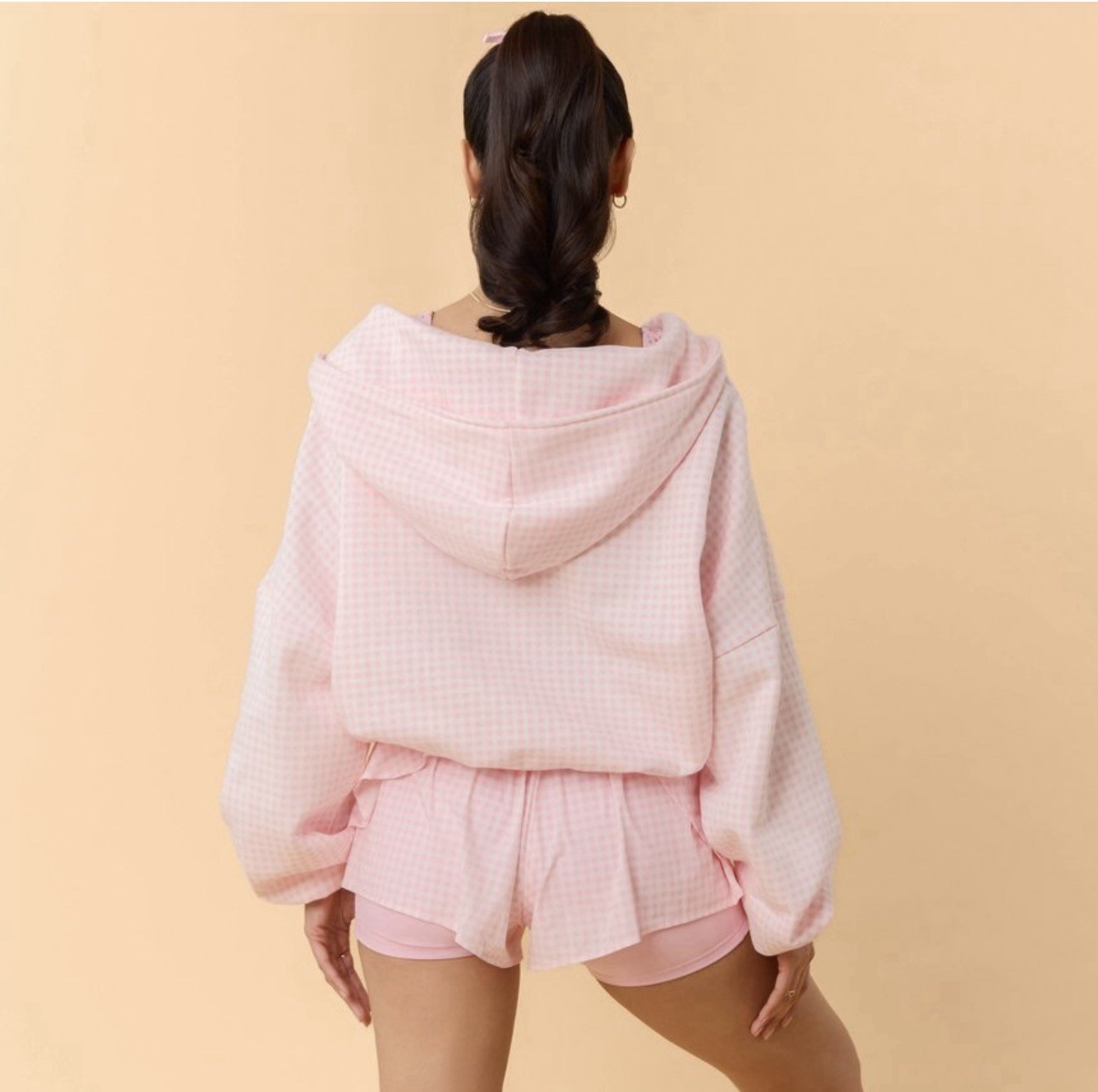 Blogilates Women s Marshmallow Full Zip Hoodie Sweatshirt Pink Gingham Size M