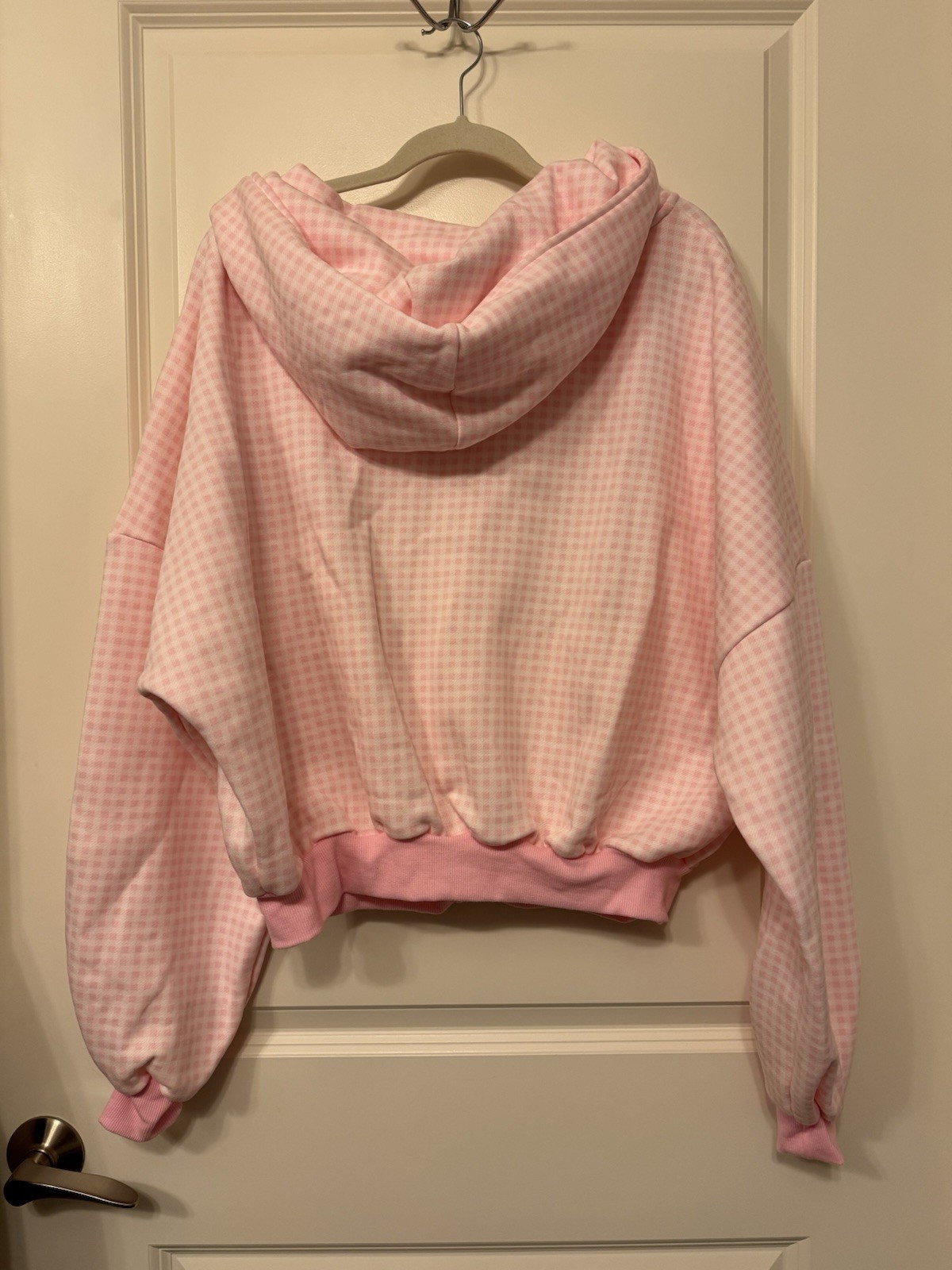 как выглядит Blogilates Women s Marshmallow Full Zip Hoodie Sweatshirt Pink Gingham Size M фото