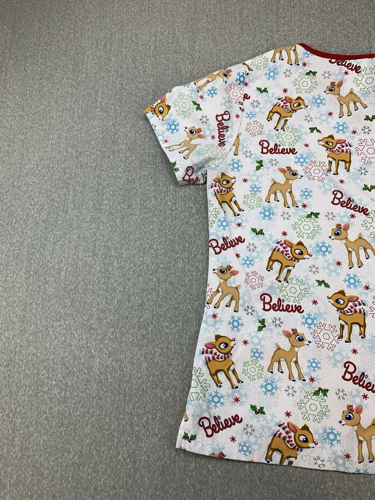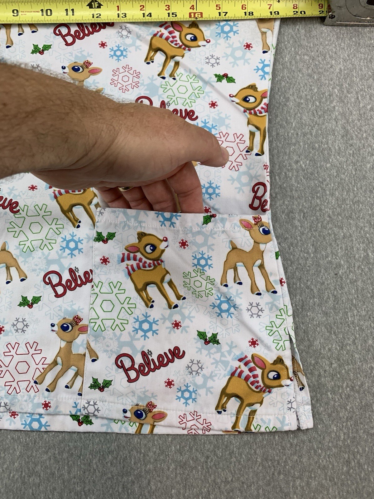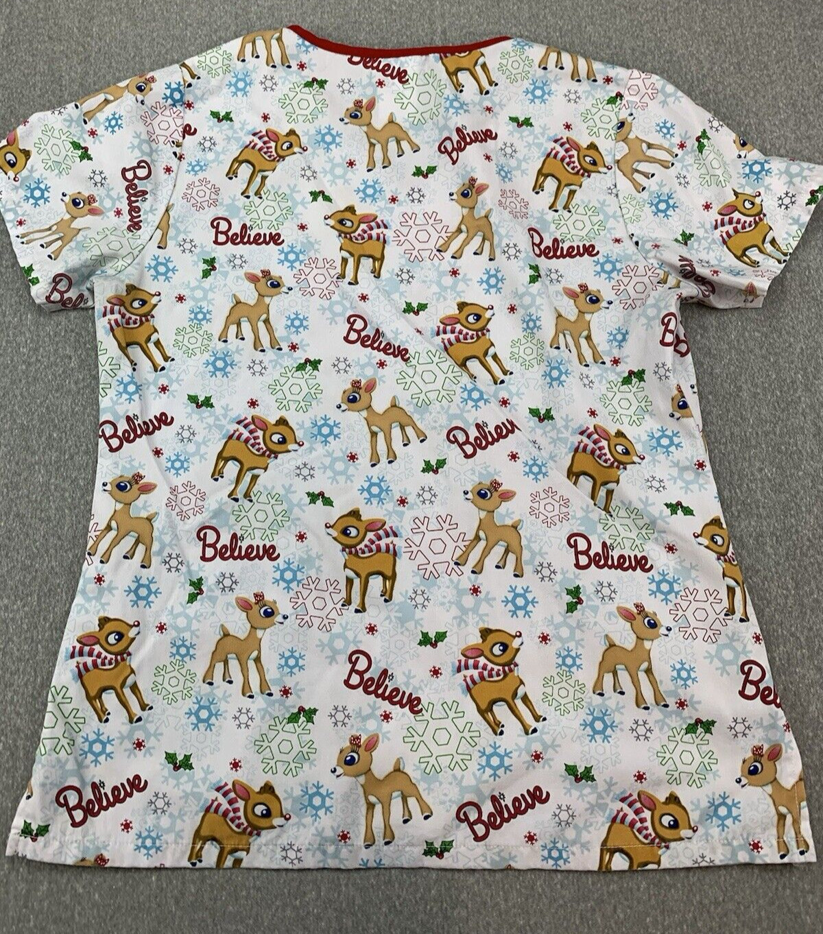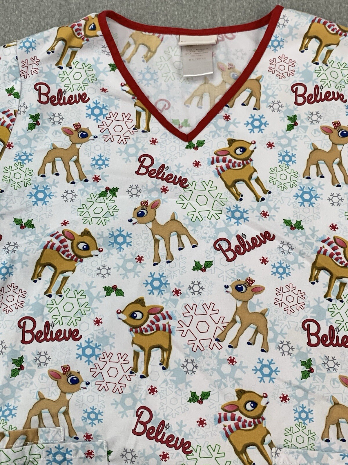 Rudolph Red-Nosed Reindeer Scrub Top Womens Size XS White AOP V-neck Pockets