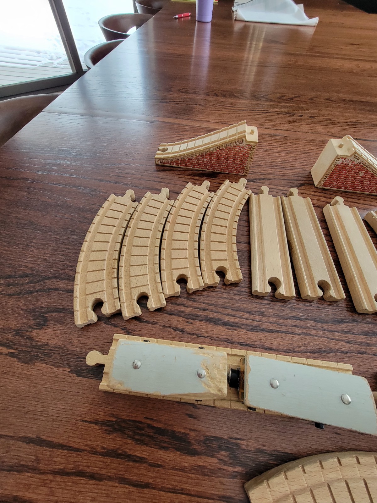 как выглядит Large Lot 21 Pcs Wooden Train And Track Pieces Brio Thomas Compatible фото