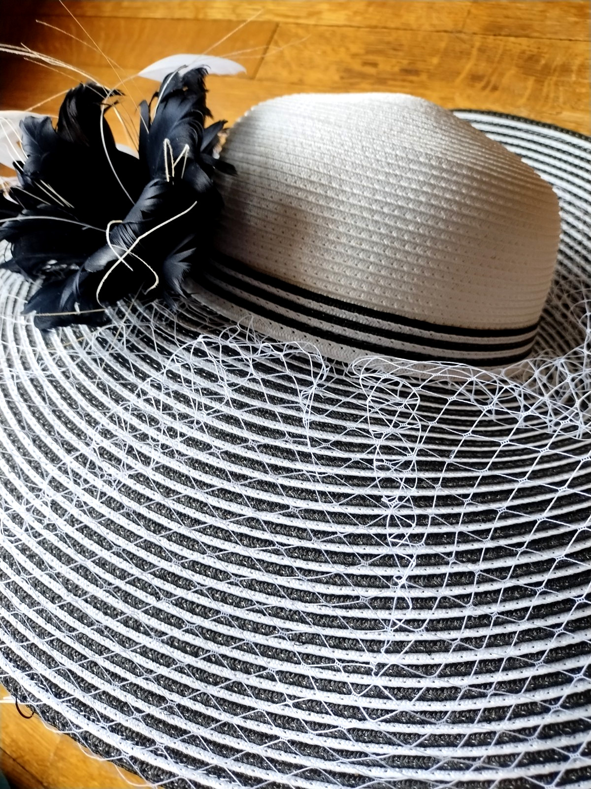 как выглядит DRESSY WHITE/BLACK HAT, WIDE BRIM, NETTING, FEATHER FLOWER, DERBY, CHURCH NWT фото