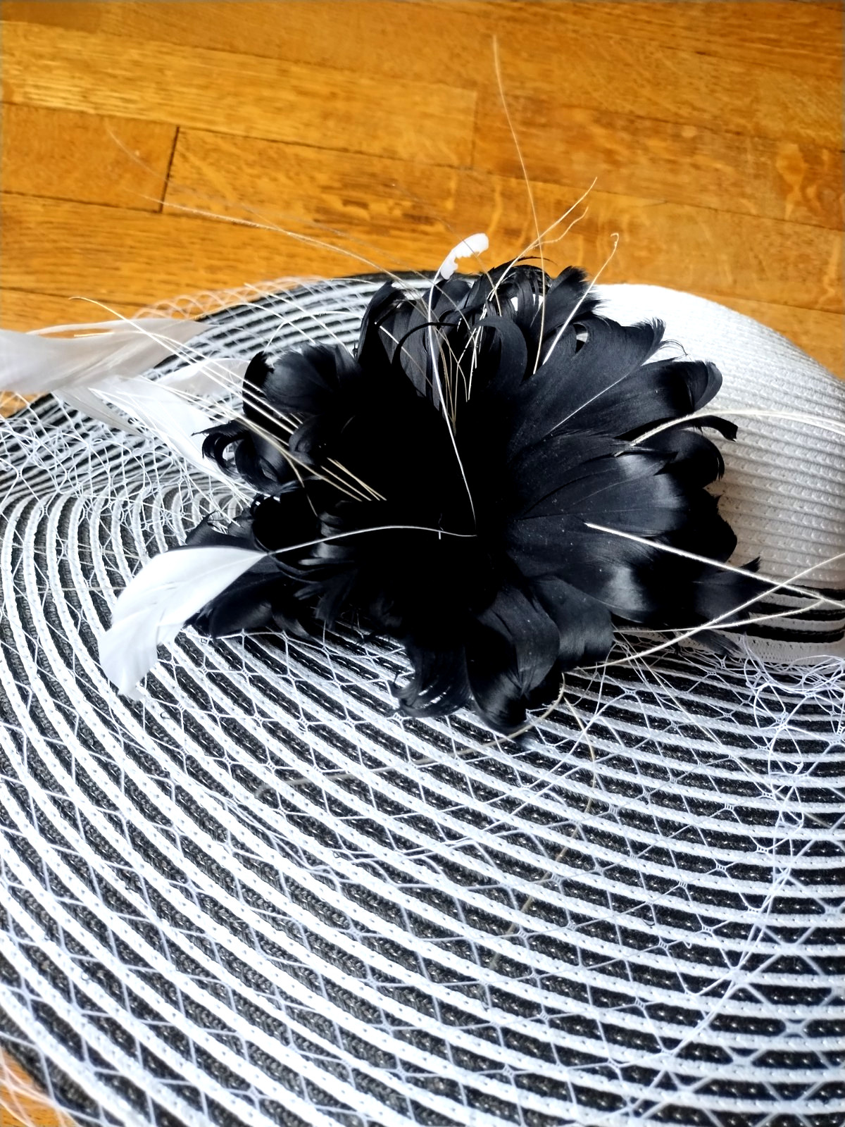 DRESSY WHITE/BLACK HAT, WIDE BRIM, NETTING, FEATHER FLOWER, DERBY, CHURCH NWT