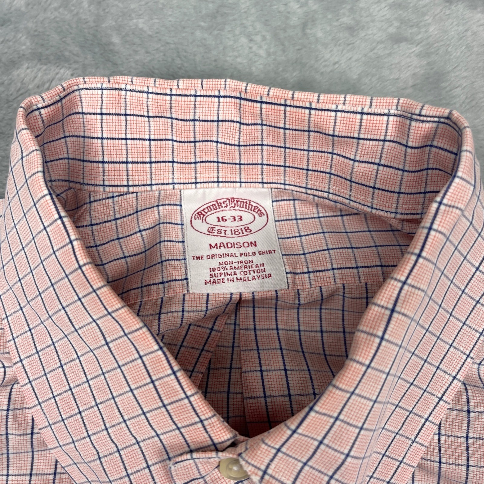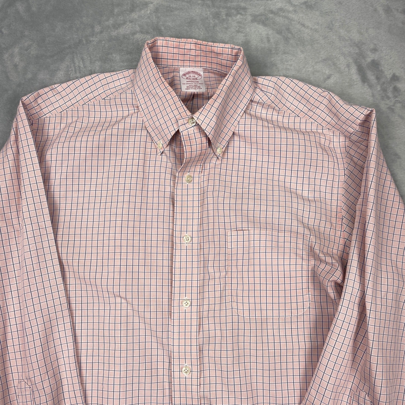 как выглядит Brooks Brothers Madison Button Down Dress Shirt 16-33 Pink Navy Check Non Iron фото