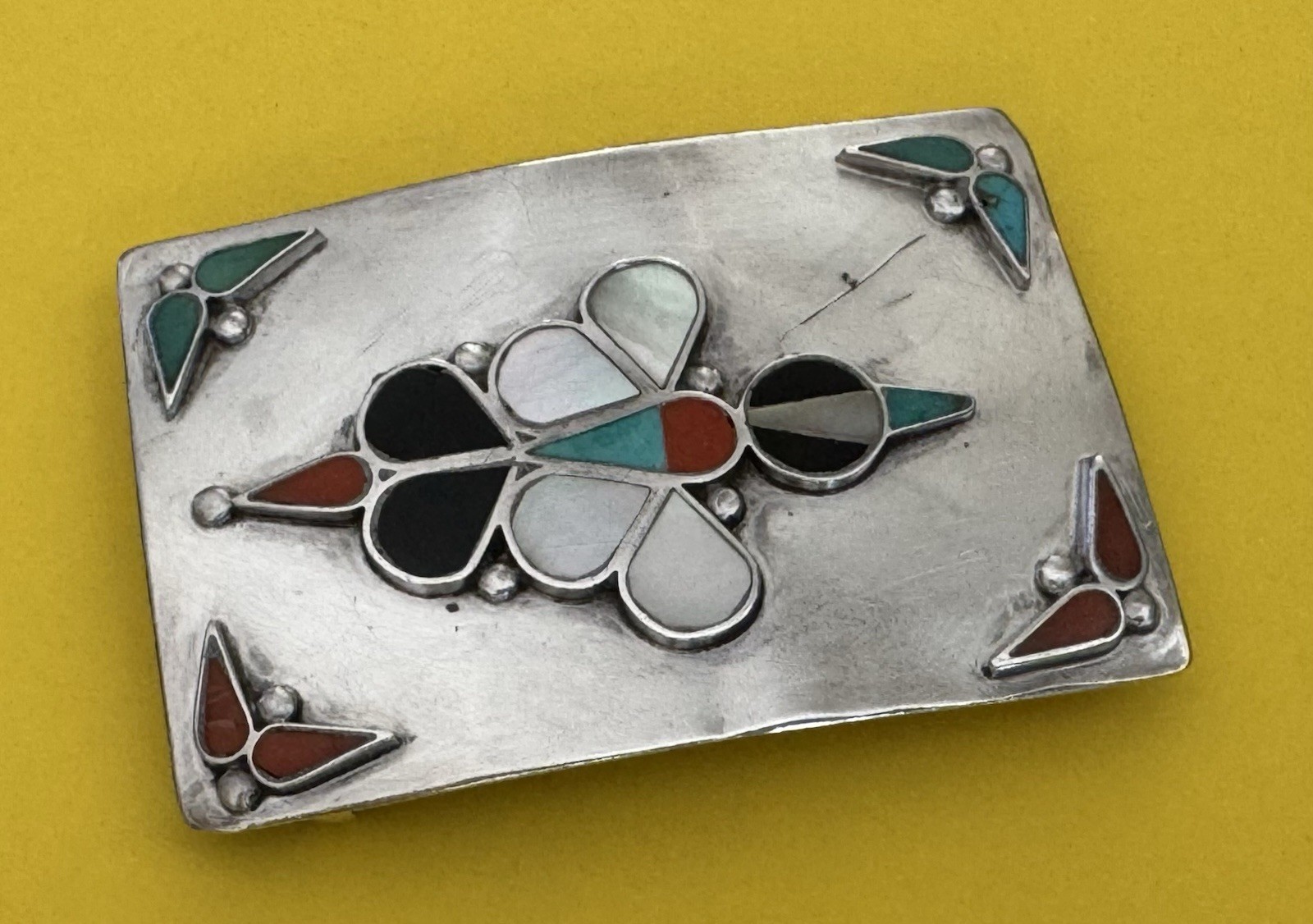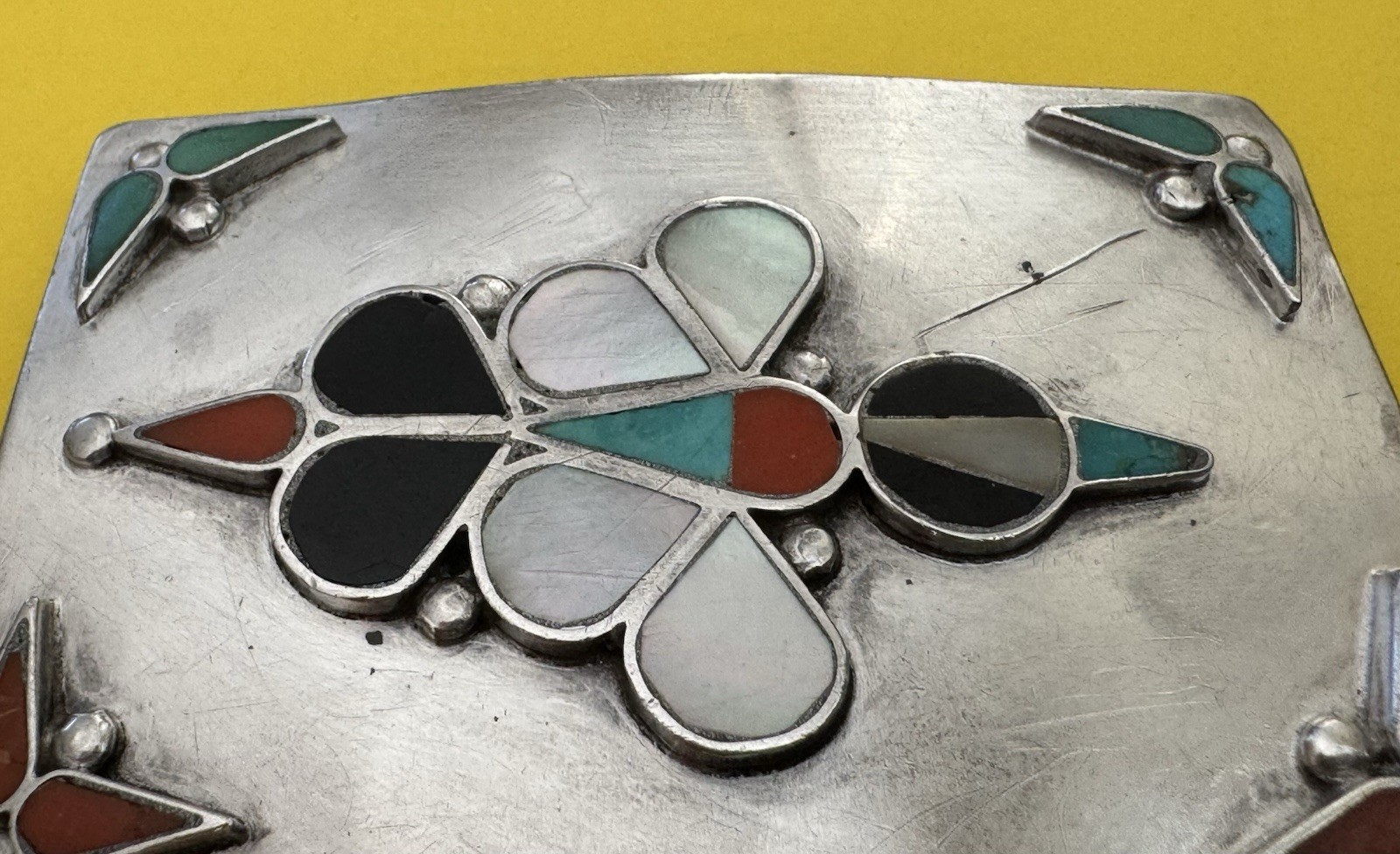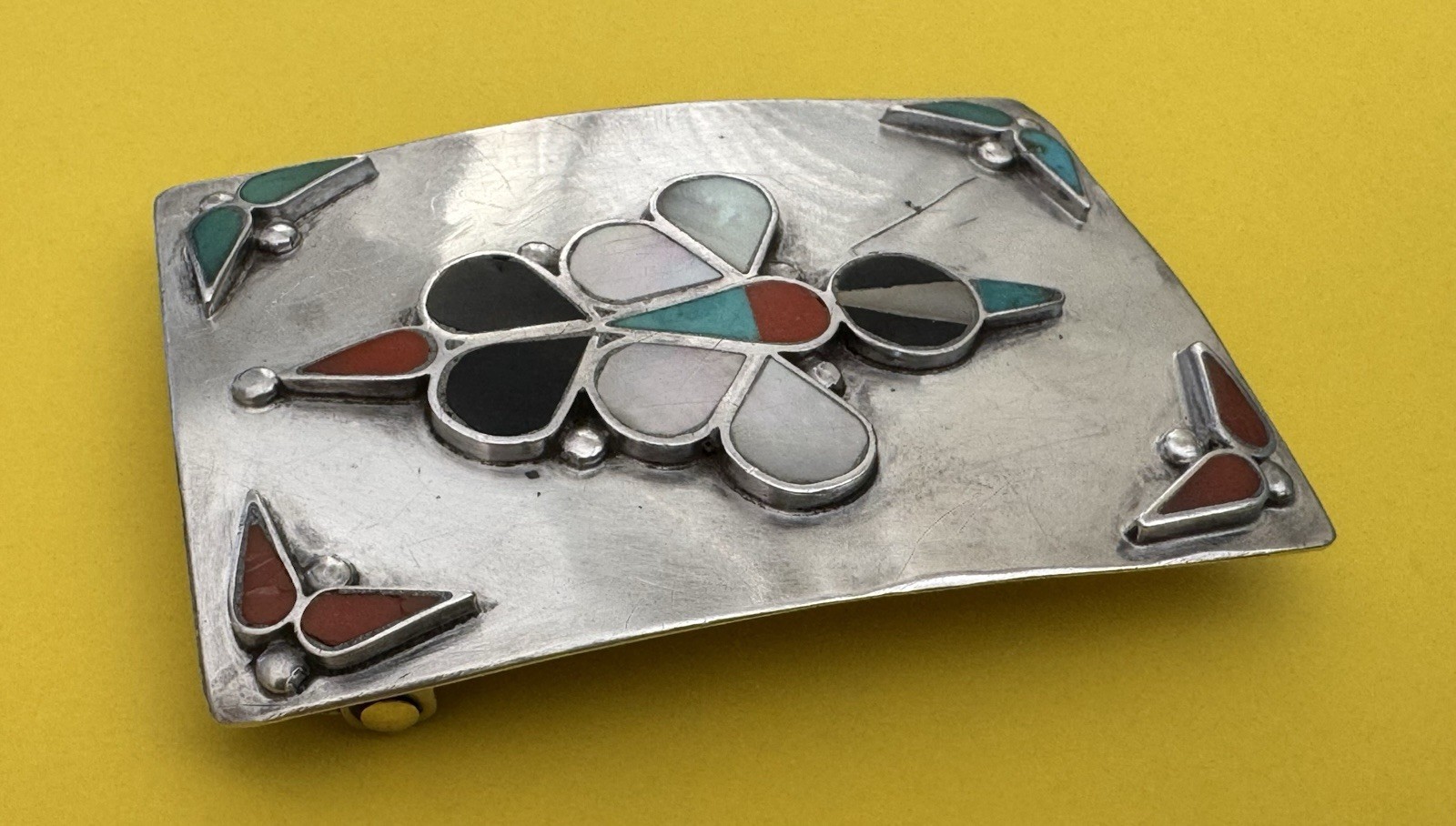 • Vintage Unbranded Sterling Silver Native American Gem Bird Inlay Belt Buckle